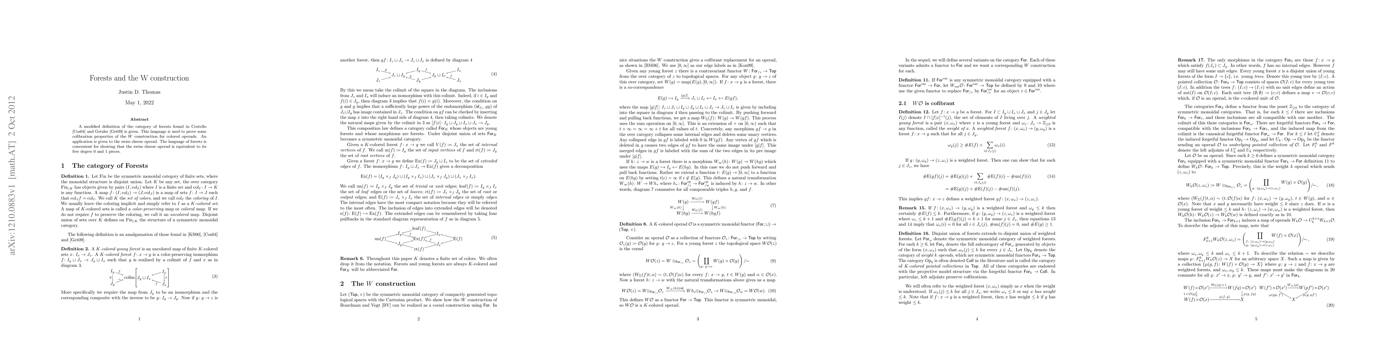 A modified definition of the category of forests by Costello and expounded upon by Getzler is given. This language is used to prove some cofibration properties of the W construction for colored operads, following the work of Berger-Moerdijk. An application is given to the swiss cheese operad. The language of forests is convenient for showing that the swiss cheese operad is equivalent to its free degree 0 and 1 pieces.
