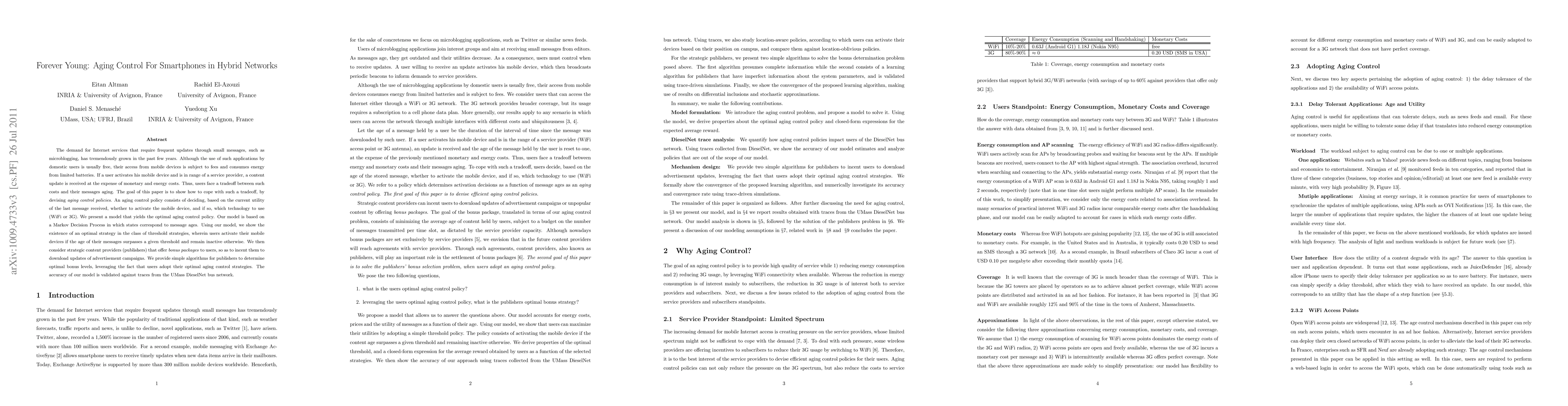 This paper proposes a model to optimize aging control for smartphones in hybrid networks, reducing energy consumption and costs associated with frequent updates. It also introduces algorithms for content providers to offer incentives, such as bonus packages, to users adopting the optimal aging strategies.