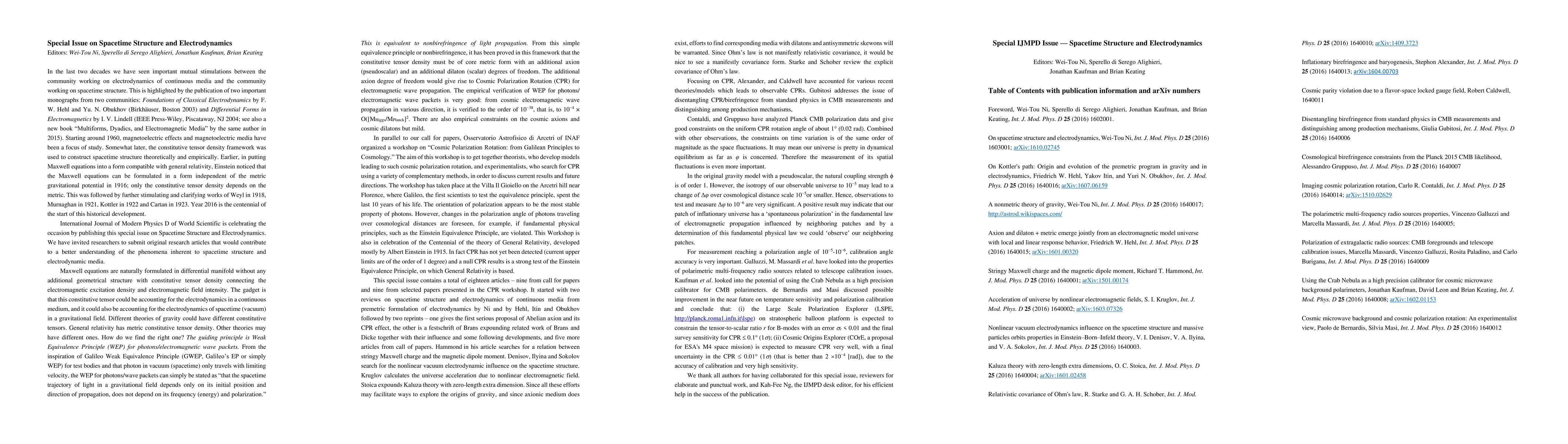 This special issue of the International Journal of Modern Physics D celebrates the centennial of the foundational works on spacetime structure and electrodynamics, highlighting the mutual advancements between electrodynamics of continuous media and spacetime theory. It invites original research articles to deepen the understanding of phenomena related to spacetime structure and electrodynamic media.
