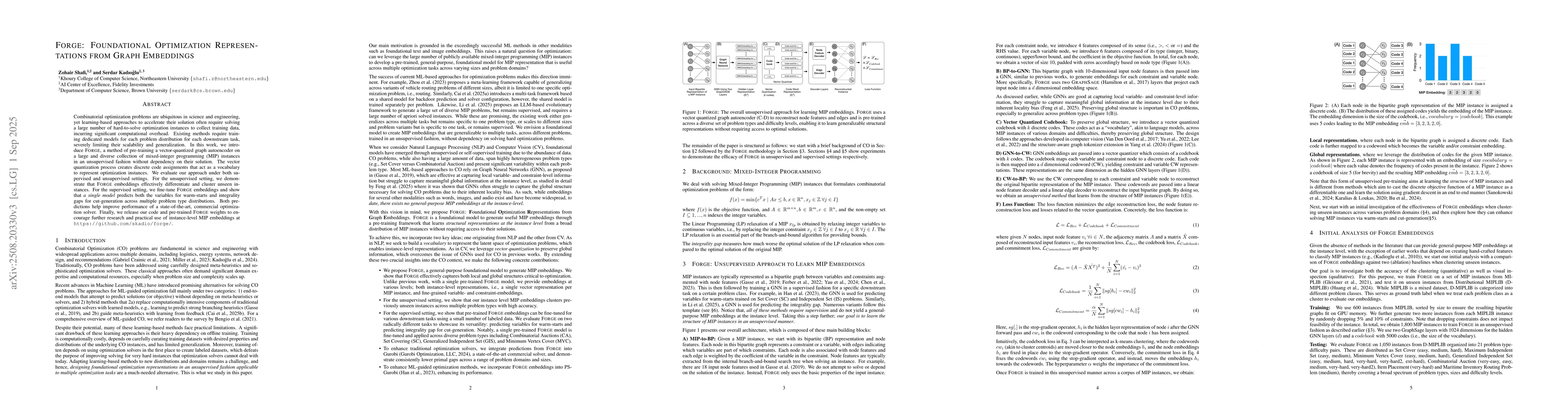 Combinatorial optimization problems are ubiquitous in science and engineering, yet learning-based approaches to accelerate their solution often require solving a large number of hard-to-solve optimization instances to collect training data, incurring significant computational overhead. Existing methods require training dedicated models for each problem distribution for each downstream task, severely limiting their scalability and generalization. In this work, we introduce Forge, a method of pre-training a vector-quantized graph autoencoder on a large and diverse collection of mixed-integer programming (MIP) instances in an unsupervised fashion without dependency on their solution. The vector quantization process creates discrete code assignments that act as a vocabulary to represent optimization instances. We evaluate our approach under both supervised and unsupervised settings. For the unsupervised setting, we demonstrate that Forge embeddings effectively differentiate and cluster unseen instances. For the supervised setting, we fine-tuneForge embeddings and show that a single model predicts both the variables for warm-starts and integrality gaps for cut-generation across multiple problem type distributions. Both predictions help improve performance of a state-of-the-art, commercial optimization solver. Finally, we release our code and pre-trained Forge weights to encourage further research and practical use of instance-level MIP embeddings at https://github.com/skadio/forge/.