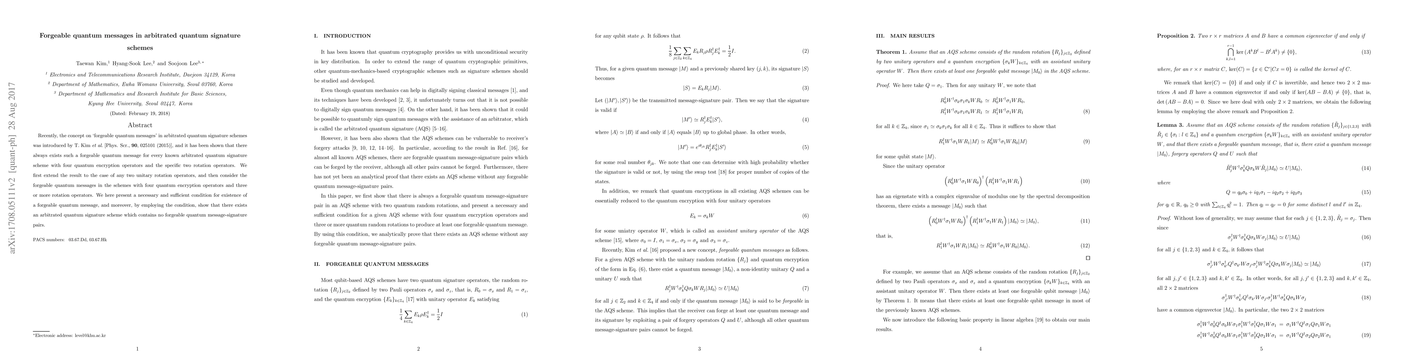 The paper introduces a necessary and sufficient condition for the existence of forgeable quantum messages in AQS schemes, providing a thorough characterization of assistant unitary operators.