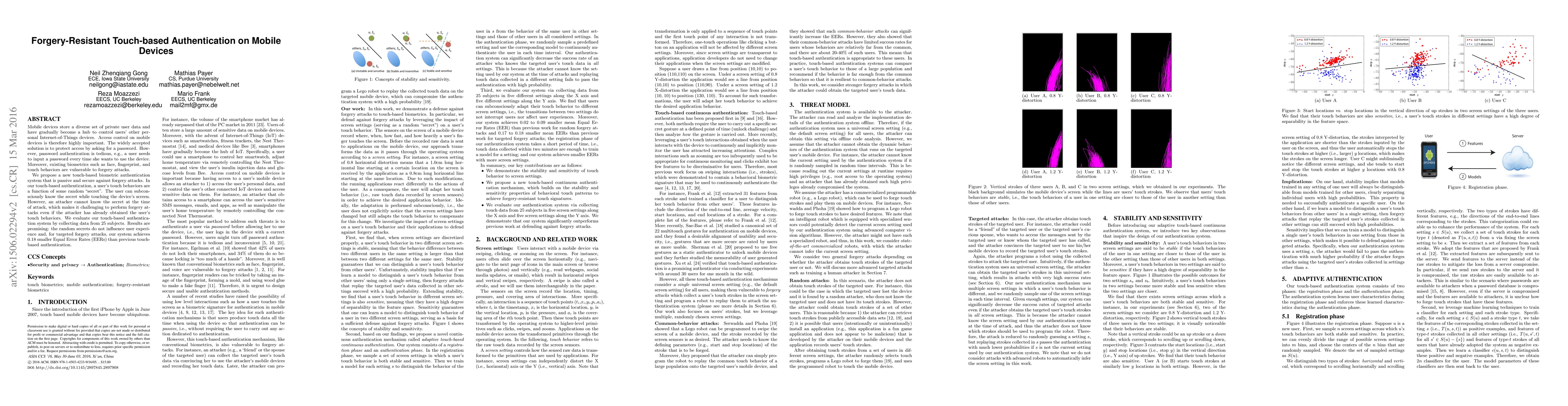 This paper proposes a forgery-resistant touch-based authentication system for mobile devices that leverages subconscious random "secrets" in touch behaviors, ensuring security against forgery attacks. Evaluations with 25 subjects show promising results, achieving 0.18 smaller Equal Error Rates compared to previous methods.