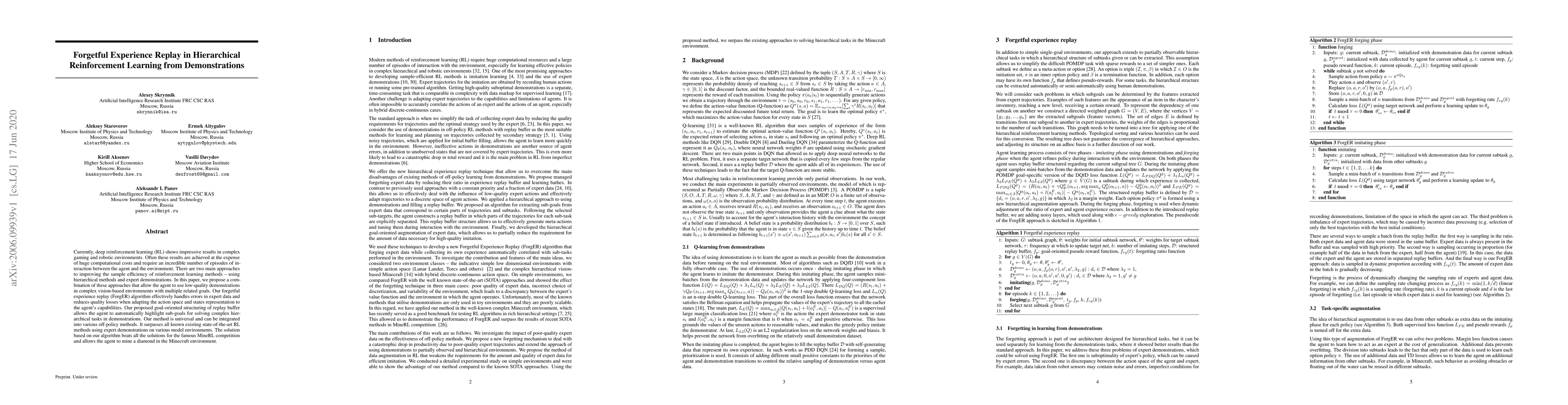 This paper proposes a forgetful experience replay (ForgER) algorithm that combines hierarchical reinforcement learning with expert demonstrations to improve sample efficiency in complex environments. ForGER effectively manages errors in demonstration data and highlights sub-goals, outperforming existing methods in various model environments and winning the MineRL competition by successfully mining a diamond in Minecraft.