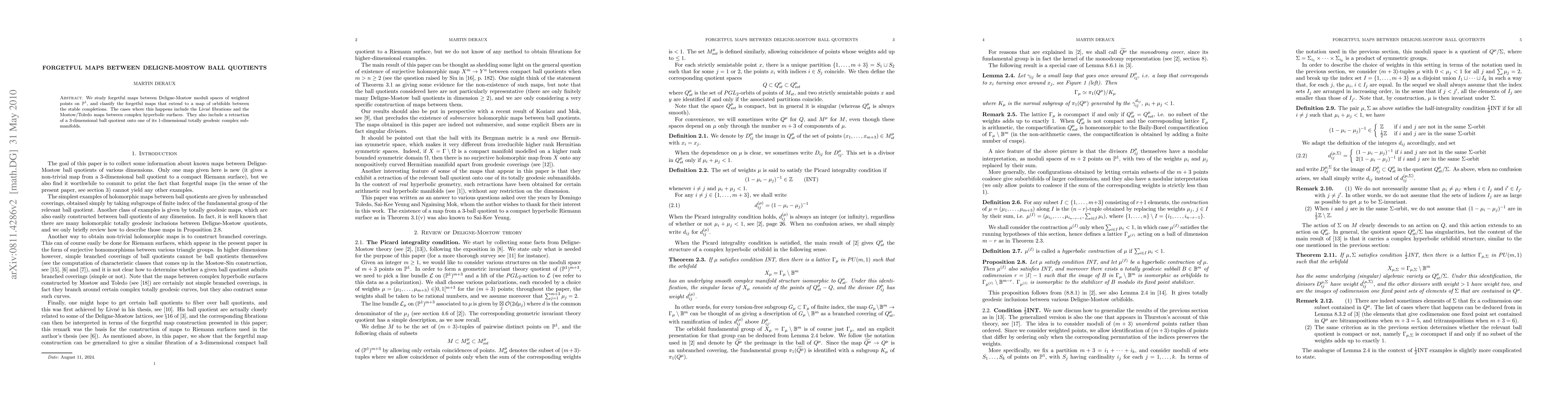 We study forgetful maps between Deligne-Mostow moduli spaces of weighted points on P^1, and classify the forgetful maps that extend to a map of orbifolds between the stable completions. The cases where this happens include the Livn\'e fibrations and the Mostow/Toledo maps between complex hyperbolic surfaces. They also include a retraction of a 3-dimensional ball quotient onto one of its 1-dimensional totally geodesic complex submanifolds.