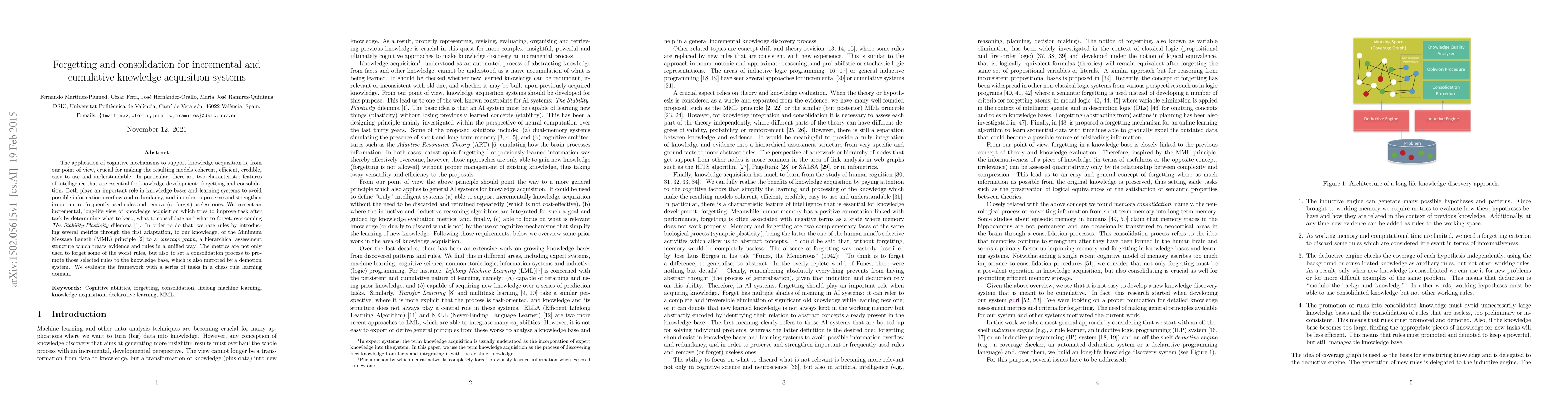 The application of cognitive mechanisms to support knowledge acquisition is, from our point of view, crucial for making the resulting models coherent, efficient, credible, easy to use and understandable. In particular, there are two characteristic features of intelligence that are essential for knowledge development: forgetting and consolidation. Both plays an important role in knowledge bases and learning systems to avoid possible information overflow and redundancy, and in order to preserve and strengthen important or frequently used rules and remove (or forget) useless ones. We present an incremental, long-life view of knowledge acquisition which tries to improve task after task by determining what to keep, what to consolidate and what to forget, overcoming The Stability-Plasticity dilemma. In order to do that, we rate rules by introducing several metrics through the first adaptation, to our knowledge, of the Minimum Message Length (MML) principle to a coverage graph, a hierarchical assessment structure which treats evidence and rules in a unified way. The metrics are not only used to forget some of the worst rules, but also to set a consolidation process to promote those selected rules to the knowledge base, which is also mirrored by a demotion system. We evaluate the framework with a series of tasks in a chess rule learning domain.