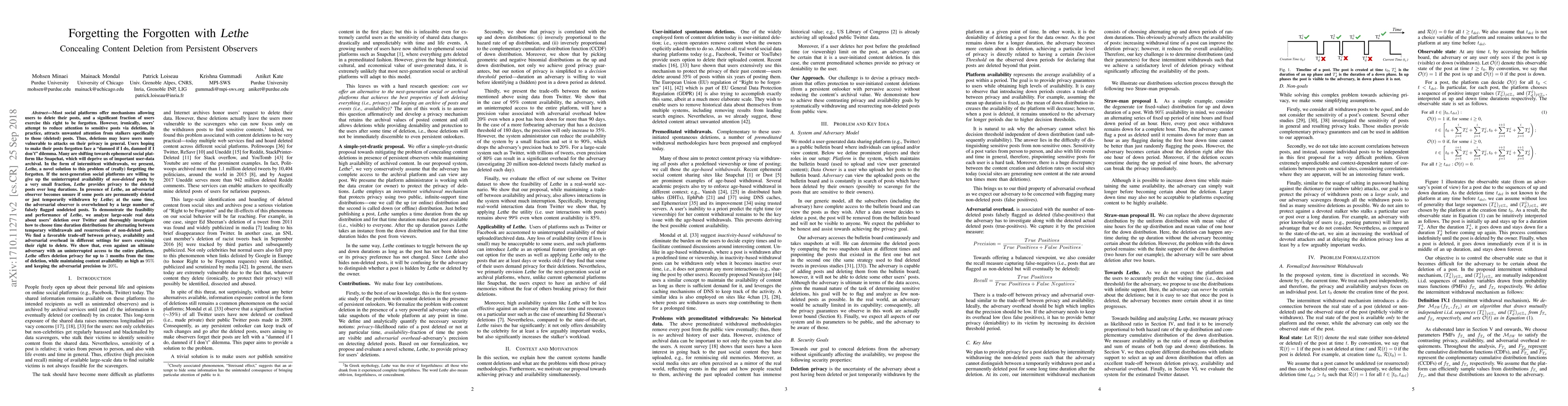 Most social platforms offer mechanisms allowing users to delete their posts, and a significant fraction of users exercise this right to be forgotten. However, ironically, users' attempt to reduce attention to sensitive posts via deletion, in practice, attracts unwanted attention from stalkers specifically to those posts. Thus, deletions may leave users more vulnerable to attacks on their privacy in general. Users hoping to make their posts forgotten face a "damned if I do, damned if I don't" dilemma. Many are shifting towards ephemeral social platform like Snapchat, which will deprive us of important user-data archival. In the form of intermittent withdrawals, we present, Lethe, a novel solution to this problem of forgetting the forgotten. If the next-generation social platforms are willing to give up the uninterrupted availability of non-deleted posts by a very small fraction, Lethe provides privacy to the deleted posts over long durations. In presence of Lethe, an adversarial observer becomes unsure if some posts are permanently deleted or just temporarily withdrawn by Lethe; at the same time, the adversarial observer is overwhelmed by a large number of falsely flagged undeleted posts. To demonstrate the feasibility and performance of Lethe, we analyze large-scale real data about users' deletion over Twitter and thoroughly investigate how to choose time duration distributions for alternating between temporary withdrawals and resurrections of non-deleted posts. We find a favorable trade-off between privacy, availability and adversarial overhead in different settings for users exercising their right to delete. We show that, even against an ultimate adversary with an uninterrupted access to the entire platform, Lethe offers deletion privacy for up to 3 months from the time of deletion, while maintaining content availability as high as 95% and keeping the adversarial precision to 20%.