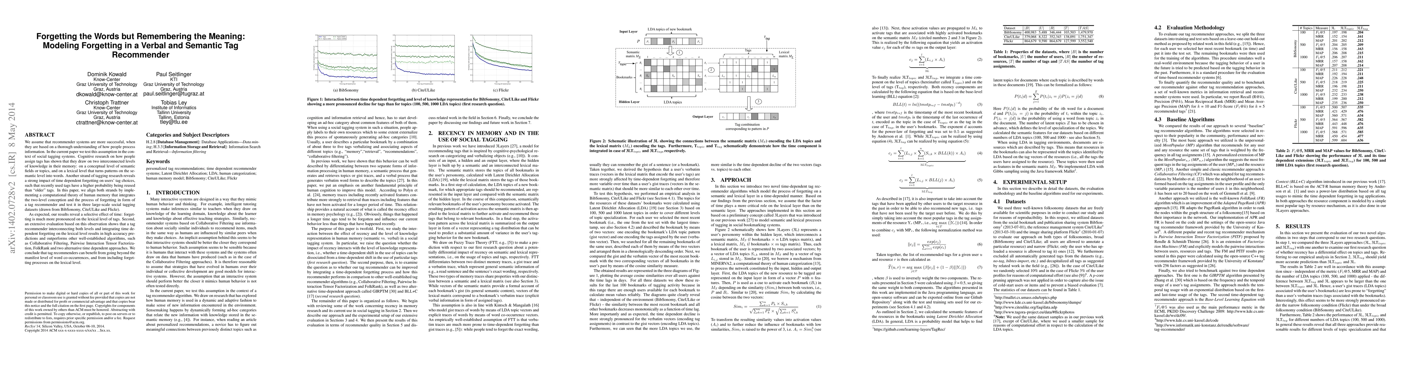 We assume that recommender systems are more successful, when they are based on a thorough understanding of how people process information. In the current paper we test this assumption in the context of social tagging systems. Cognitive research on how people assign tags has shown that they draw on two interconnected levels of knowledge in their memory: on a conceptual level of semantic fields or topics, and on a lexical level that turns patterns on the semantic level into words. Another strand of tagging research reveals a strong impact of time dependent forgetting on users' tag choices, such that recently used tags have a higher probability being reused than "older" tags. In this paper, we align both strands by implementing a computational theory of human memory that integrates the two-level conception and the process of forgetting in form of a tag recommender and test it in three large-scale social tagging datasets (drawn from BibSonomy, CiteULike and Flickr). As expected, our results reveal a selective effect of time: forgetting is much more pronounced on the lexical level of tags. Second, an extensive evaluation based on this observation shows that a tag recommender interconnecting both levels and integrating time dependent forgetting on the lexical level results in high accuracy predictions and outperforms other well-established algorithms, such as Collaborative Filtering, Pairwise Interaction Tensor Factorization, FolkRank and two alternative time dependent approaches. We conclude that tag recommenders can benefit from going beyond the manifest level of word co-occurrences, and from including forgetting processes on the lexical level.