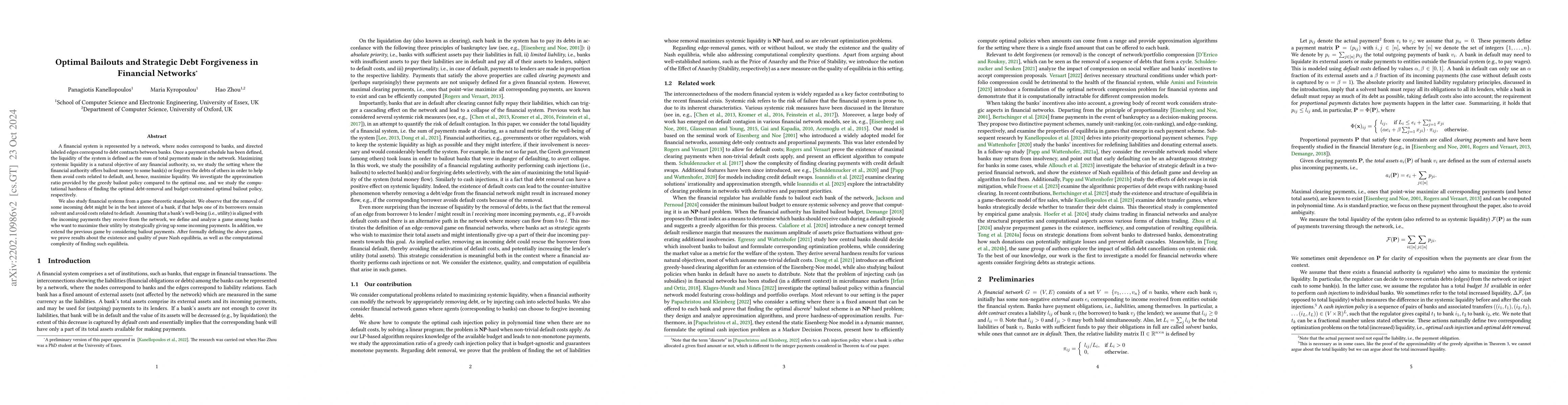 This paper explores financial networks where banks represent nodes and debt contracts are directed edges. It investigates strategies to maximize systemic liquidity through debt forgiveness or bailouts, comparing greedy bailout policies to optimal solutions and examining their computational complexity. Additionally, it models the situation as a game-theoretic problem where banks strategically decide to forgo incoming payments to maximize their utility, analyzing the existence and quality of Nash equilibria.