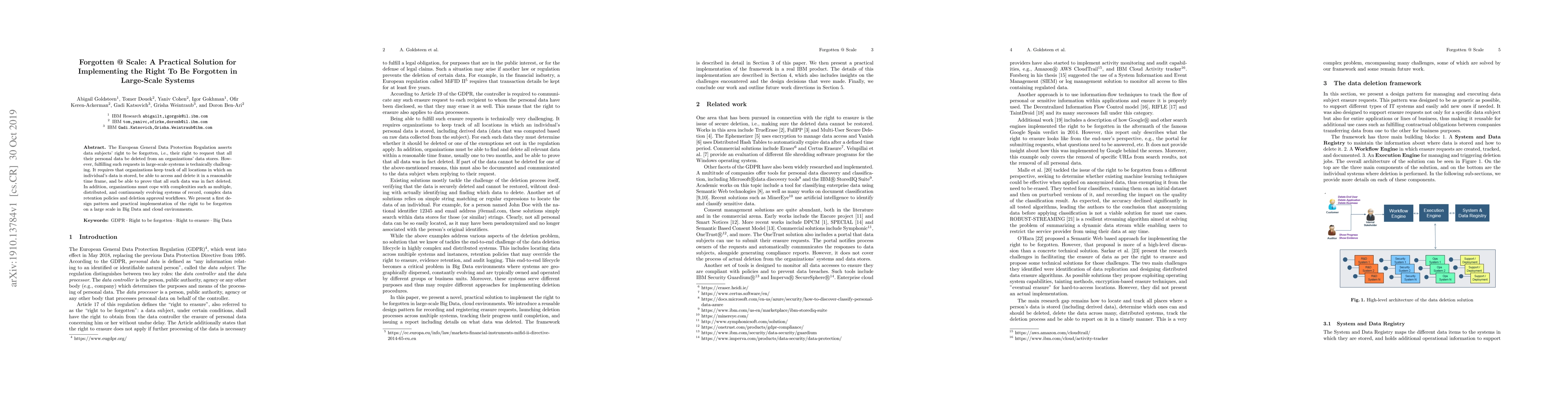 This paper proposes a design pattern and practical implementation for fulfilling the right to be forgotten under the European General Data Protection Regulation in large-scale systems, addressing challenges like data tracking, deletion, and compliance with complex data retention policies. The solution is tailored for Big Data and cloud environments.