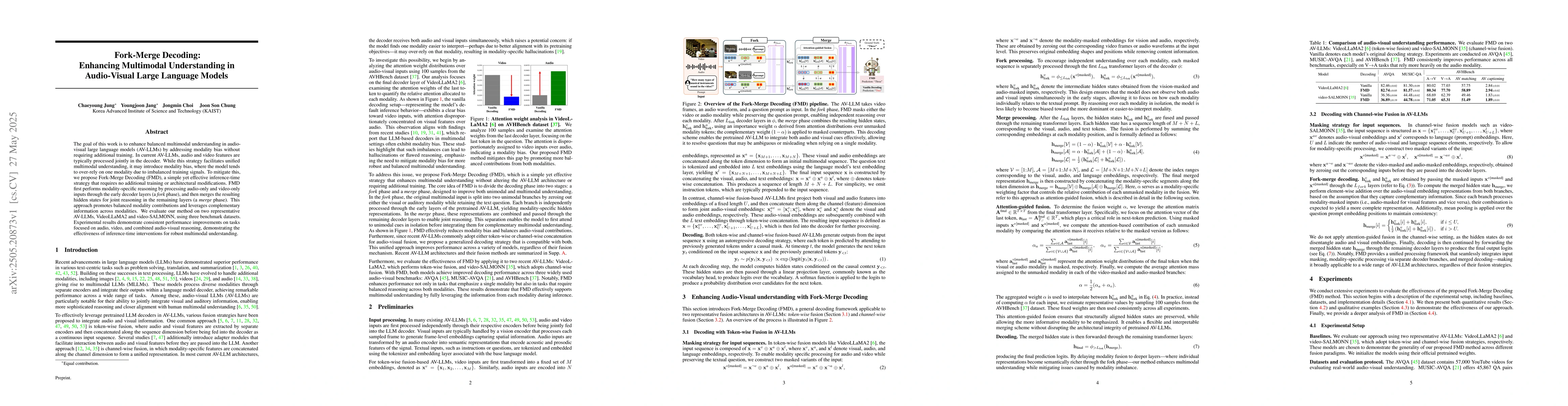 Fork-Merge Decoding (FMD), an inference-time strategy that balances modality contributions in AV-LLMs by performing modality-specific reasoning followed by merging hidden states.