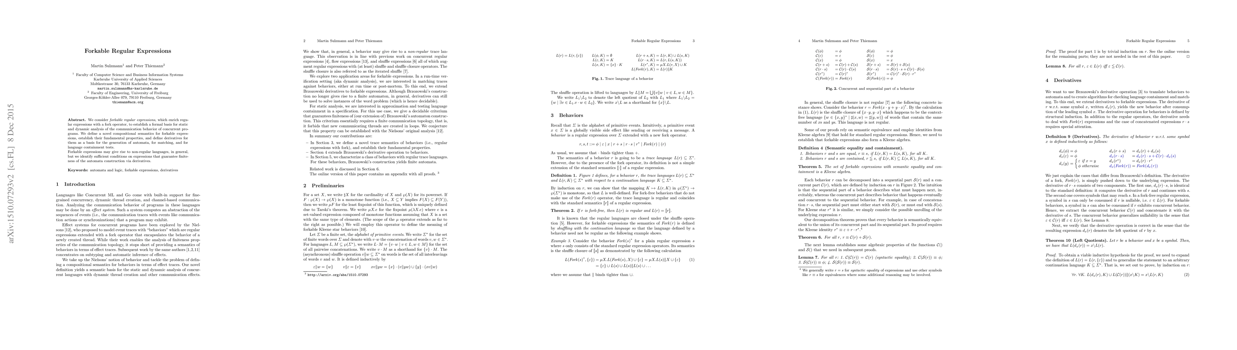 This paper explores forkable regular expressions, which extend traditional regular expressions with a fork operator for analyzing concurrent programs. It introduces a new compositional semantics, fundamental properties, and derivatives for generating automata and conducting language containment tests, ensuring finite automata under specific conditions.