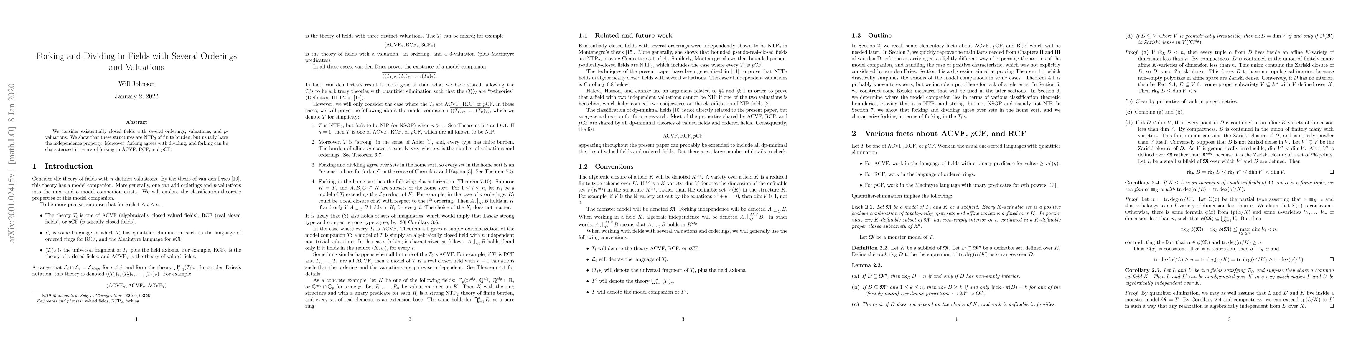 This paper demonstrates that existentially closed fields with multiple orderings, valuations, and $p$-valuations are NTP$_2$ of finite burden and typically exhibit the independence property. It also shows that forking in these fields aligns with dividing and can be characterized through forking in ACVF, RCF, and $p$CF.