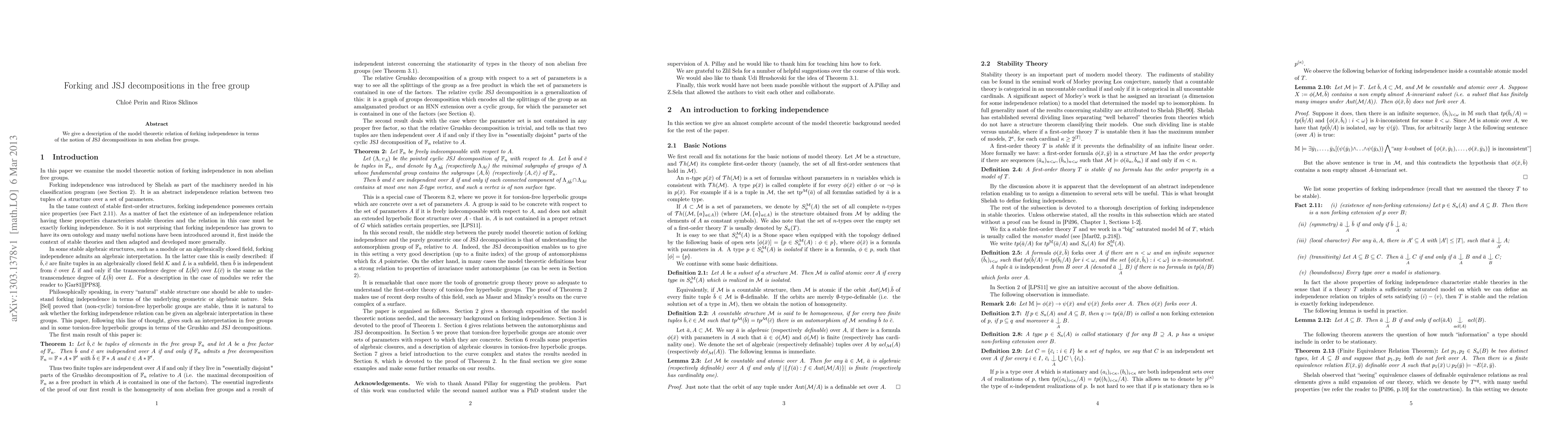 We give a description of the model theoretic relation of forking independence in terms of the notion of JSJ decompositions in non abelian free groups.