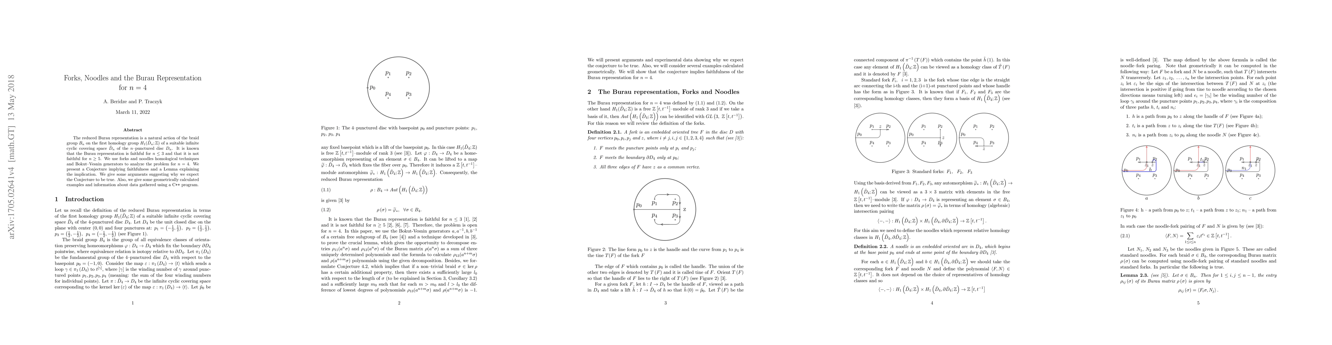 \begin{abstract} The reduced Burau representation is a natural action of the braid group $B_n$ on the first homology group $H_1({\tilde{D}}_n;\mathbb{Z})$ of a suitable infinite cyclic covering space ${\tilde{D}}_n$ of the $n$--punctured disc $D_n$. It is known that the Burau representation is faithful for $n\le 3$ and that it is not faithful for $n\ge 5$. We use forks and noodles homological techniques and Bokut--Vesnin generators to analyze the problem for $n=4$. We present a Conjecture implying faithfulness and a Lemma explaining the implication. We give some arguments suggesting why we expect the Conjecture to be true. Also, we give some geometrically calculated examples and information about data gathered using a C\texttt{++} program.