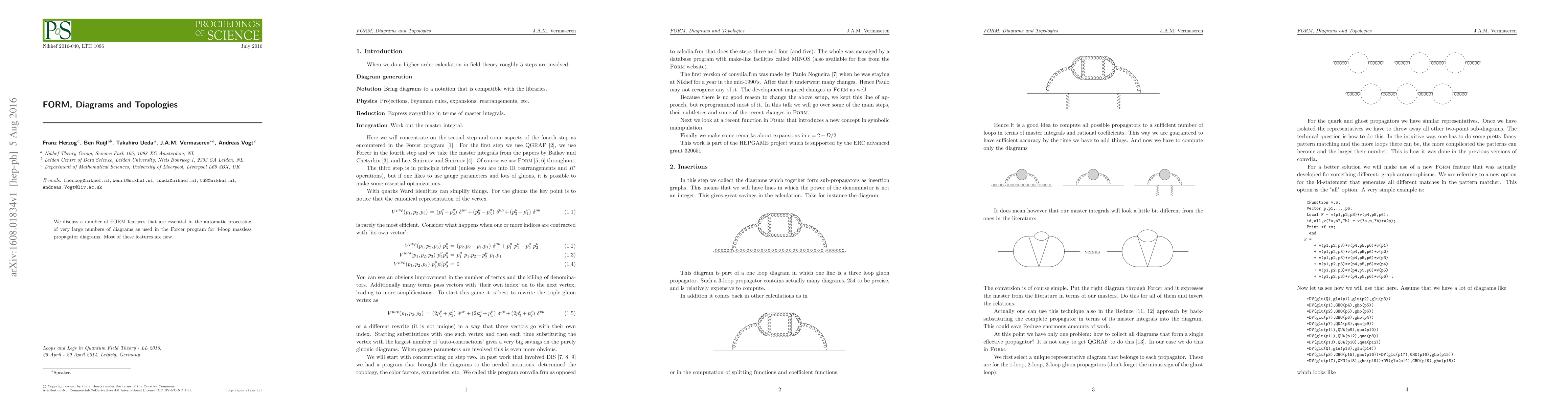 We discuss a number of FORM features that are essential in the automatic processing of very large numbers of diagrams as used in the Forcer program for 4-loop massless propagator diagrams. Most of these features are new.