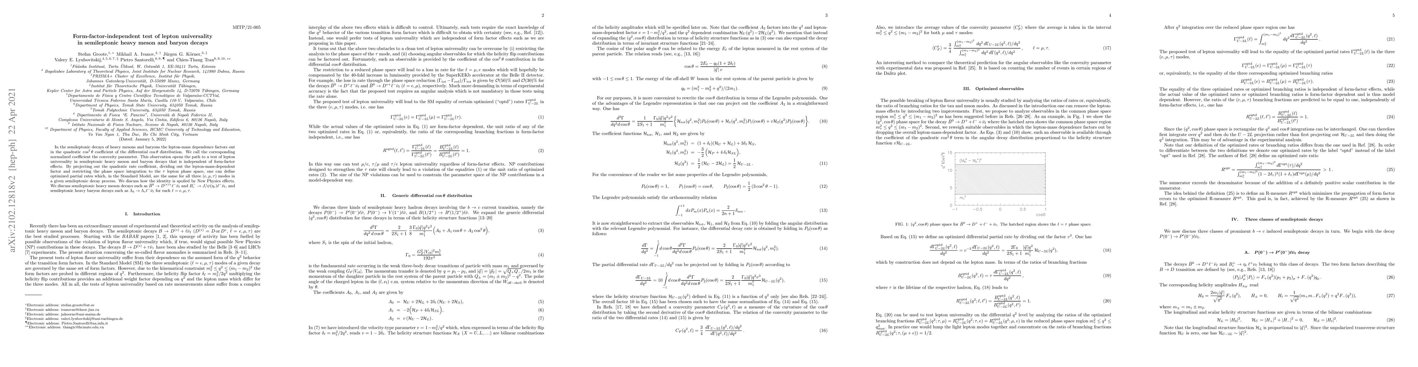 In the semileptonic decays of heavy mesons and baryons the lepton-mass dependence factors out in the quadratic $\cos^2\theta$ coefficient of the differential $\cos\theta$ distribution. We call the corresponding normalized coefficient the convexity parameter. This observation opens the path to a test of lepton universality in semileptonic heavy meson and baryon decays that is independent of form-factor effects. By projecting out the quadratic rate coefficient, dividing out the lepton-mass-dependent factor and restricting the phase space integration to the $\tau$ lepton phase space, one can define optimized partial rates which, in the Standard Model, are the same for all three $(e,\mu,\tau)$ modes in a given semileptonic decay process. We discuss how the identity is spoiled by New Physics effects. We discuss semileptonic heavy meson decays such as $\bar{B}^0 \to D^{(\ast)+} \ell^- \bar\nu_\ell$ and $B_c^- \to J/\psi (\eta_c)\ell^- \bar\nu_\ell$, and semileptonic heavy baryon decays such as $\Lambda_b \to \Lambda_c \ell^- \bar\nu_\ell$ for each $\ell=e,\mu,\tau$.