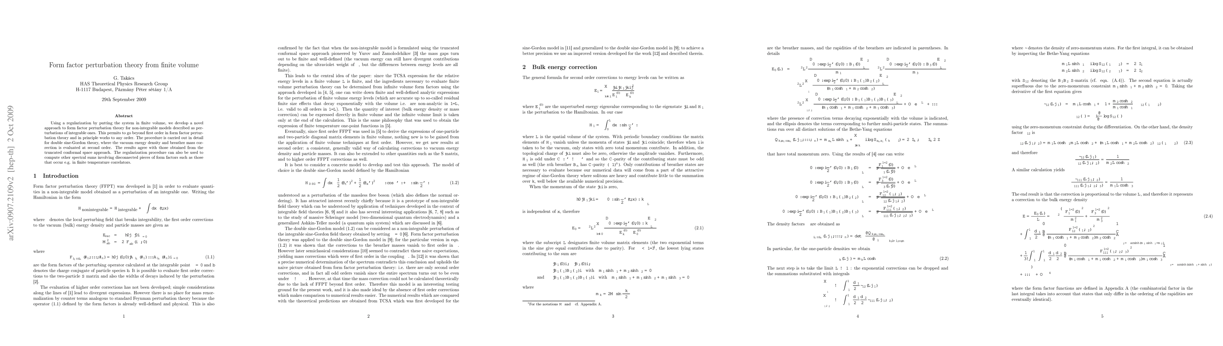 Using a regularization by putting the system in finite volume, we develop a novel approach to form factor perturbation theory for nonintegrable models described as perturbations of integrable ones. This permits to go beyond first order in form factor perturbation theory and in principle works to any order. The procedure is carried out in detail for double sine-Gordon theory, where the vacuum energy density and breather mass correction is evaluated at second order. The results agree with those obtained from the truncated conformal space approach. The regularization procedure can also be used to compute other spectral sums involving disconnected pieces of form factors such as those that occur e.g. in finite temperature correlators.