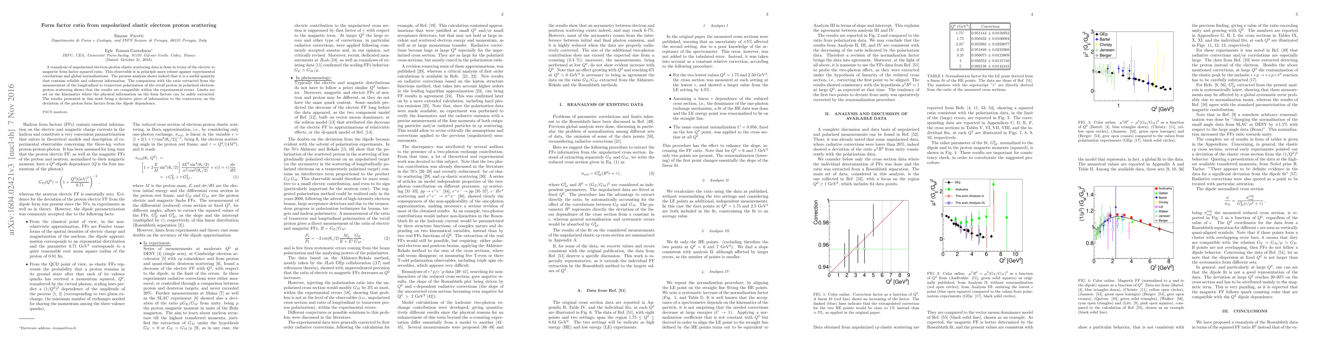 This paper reanalyzes unpolarized electron-proton elastic scattering data to study the electric to magnetic form factor squared ratio, demonstrating its robustness against experimental errors. The findings are consistent with results from polarized scattering, providing reliable information and resolving some controversy regarding the proton form factors' deviation from dipole dependence.
