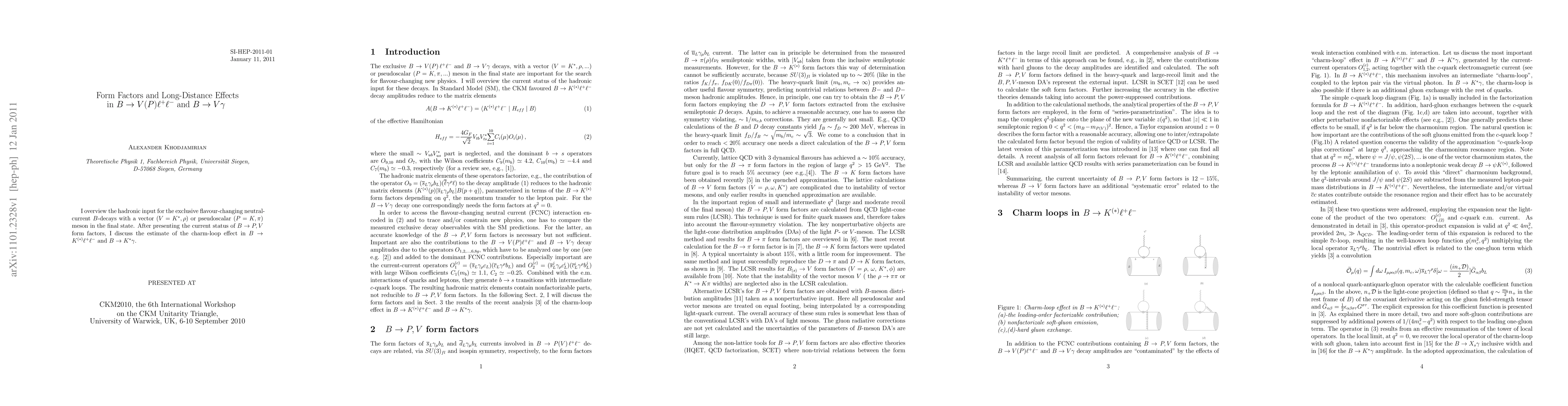 I overview the hadronic input for the exclusive flavour-changing neutral-current $B$-decays with a vector ($V=K^*,\rho$) or pseudoscalar ($P=K,\pi$) meson in the final state. After presenting the current status of $B\to P,V$ form factors, I discuss the estimate of the charm-loop effect in $B\to K^{(*)} \ell^+\ell^-$ and $B\to K^* \gamma$.