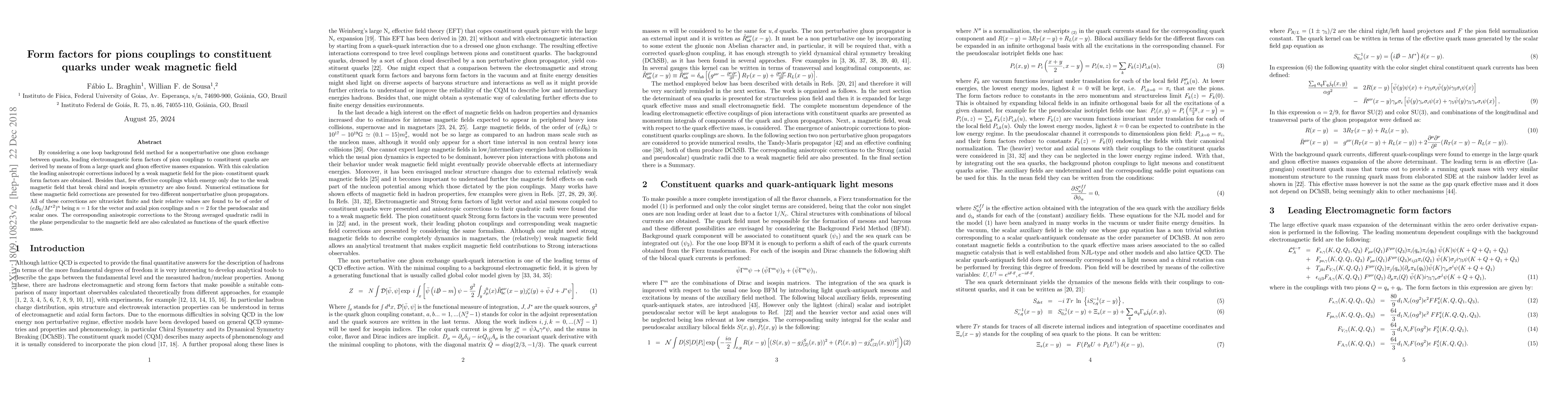 This paper derives leading anisotropic corrections to pion-constituent quark form factors under a weak magnetic field using a one-loop background field method. It finds new effective couplings breaking chiral and isospin symmetry, and estimates the corrections' relative values as functions of the quark effective mass.