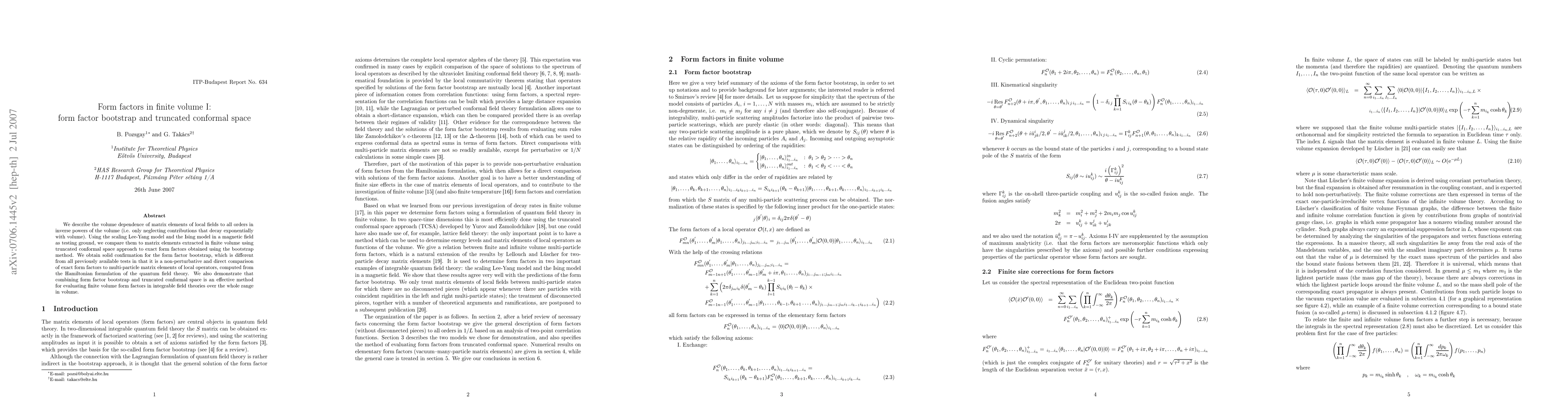 This paper investigates the volume dependence of matrix elements of local fields using the form factor bootstrap and truncated conformal space approach. It provides a non-perturbative comparison of exact form factors to multi-particle matrix elements, confirming the effectiveness of the form factor bootstrap and demonstrating its combination with truncated conformal space for evaluating finite volume form factors in integrable field theories.