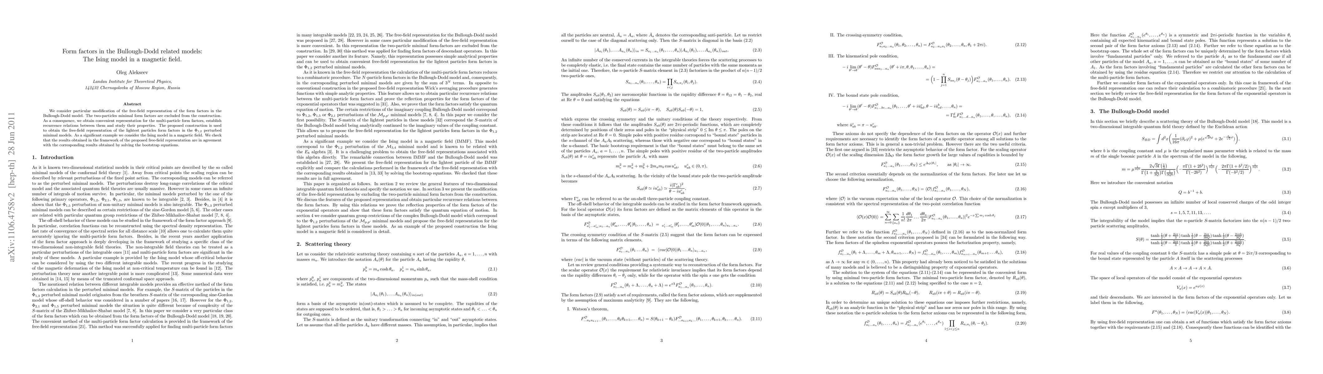 This paper modifies the free-field representation of form factors in the Bullough-Dodd model, excluding two-particle minimal form factors, and provides a convenient representation for multi-particle form factors. The method is applied to the Ising model in a magnetic field, showing agreement with bootstrap equation results.