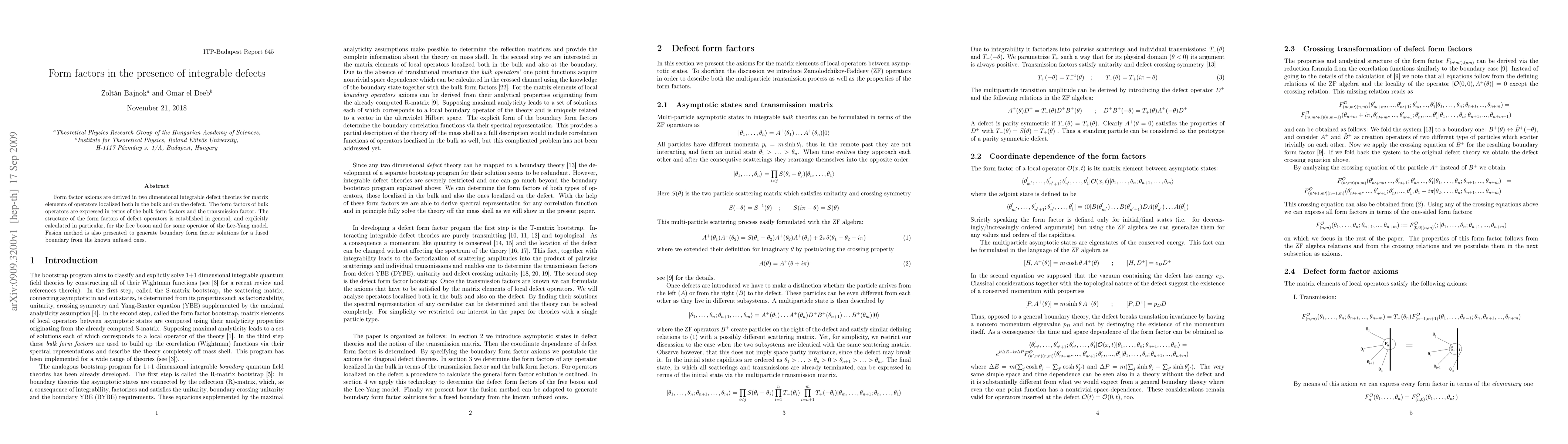 This paper derives form factor axioms for two-dimensional integrable defect theories, expressing bulk operator form factors in terms of bulk form factors and transmission factors. It also establishes the structure of defect operator form factors, explicitly calculating them for the free boson and Lee-Yang model, and introduces a fusion method to generate boundary form factor solutions.