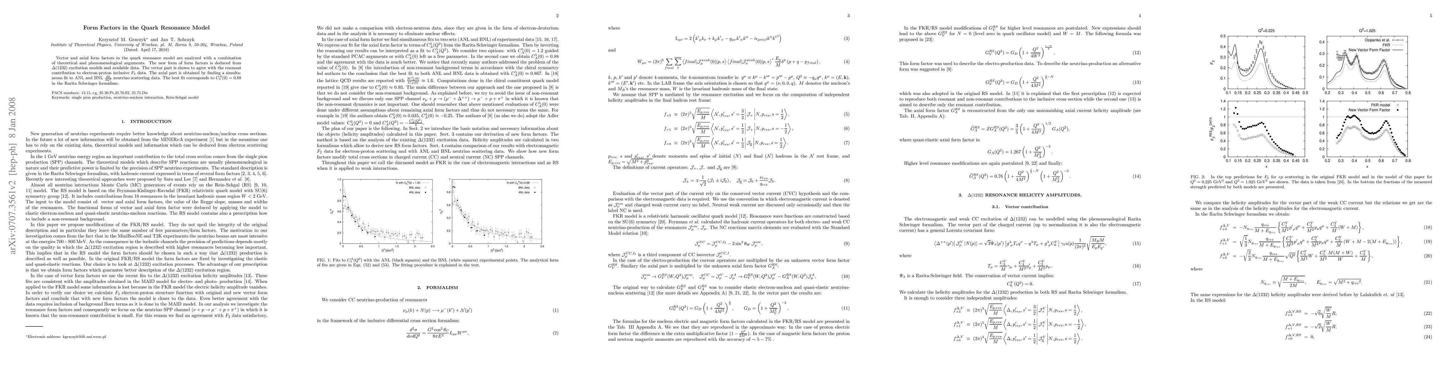 Vector and axial form factors in the quark resonance model are analyzed with a combination of theoretical and phenomenological arguments. The new form of form factors is deduced from $\Delta$(1232) excitation models and available data. The vector part is shown to agree with the resonant contribution to electron-proton inclusive $F_2$ data. The axial part is obtained by finding a simultaneous fit to ANL and BNL $\frac{d \sigma}{d Q^2}$ neutrino scattering data. The best fit corresponds to $C_5^A(0)=0.88$ in the Rarita Schwinger formalism.