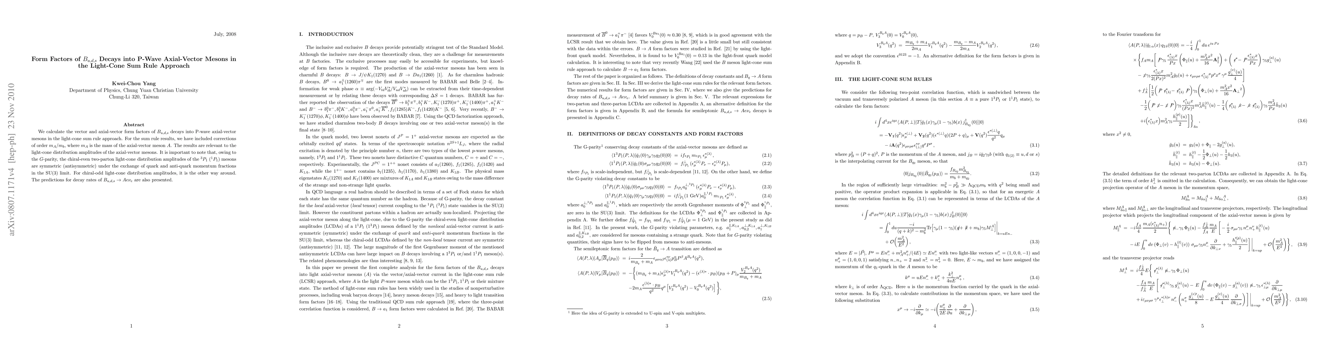 This paper calculates form factors for $B_{u,d,s}$ decays into P-wave axial-vector mesons using the light-cone sum rule approach, including corrections for $m_A/m_b$. It discusses the implications for light-cone distribution amplitudes and presents predictions for decay rates of $B_{u,d,s} \to A e \nu_e$.