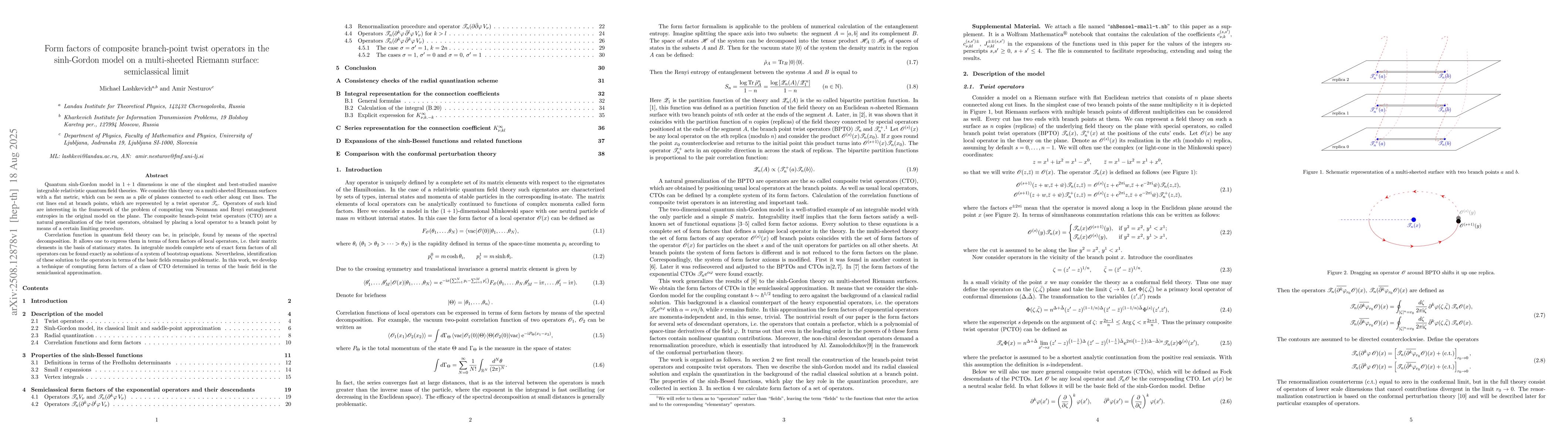 Quantum sinh-Gordon model in 1+1 dimensions is one of the simplest and best-studied massive integrable relativistic quantum field theories. We consider this theory on a multi-sheeted Riemann surfaces with a flat metric, which can be seen as a pile of planes connected to each other along cut lines. The cut lines end at branch points, which are represented by a twist operator ${\cal T}_n.$ Operators of such kind are interesting in the framework of the problem of computing von Neumann and Renyi entanglement entropies in the original model on the plane. The composite branch-point twist operators (CTO) are a natural generalization of the twist operators, obtained by placing a local operator to a branch point by means of a certain limiting procedure. Correlation function in quantum field theory can be, in principle, found by means of the spectral decomposition. It allows one to express them in terms of form factors of local operators, i.e. their matrix elements in the basis of stationary states. In integrable models complete sets of exact form factors of all operators can be found exactly as solutions of a system of bootstrap equations. Nevertheless, identification of these solution to the operators in terms of the basic fields remains problematic. In this work, we develop a technique of computing form factors of a class of CTO determined in terms of the basic field in the semiclassical approximation.