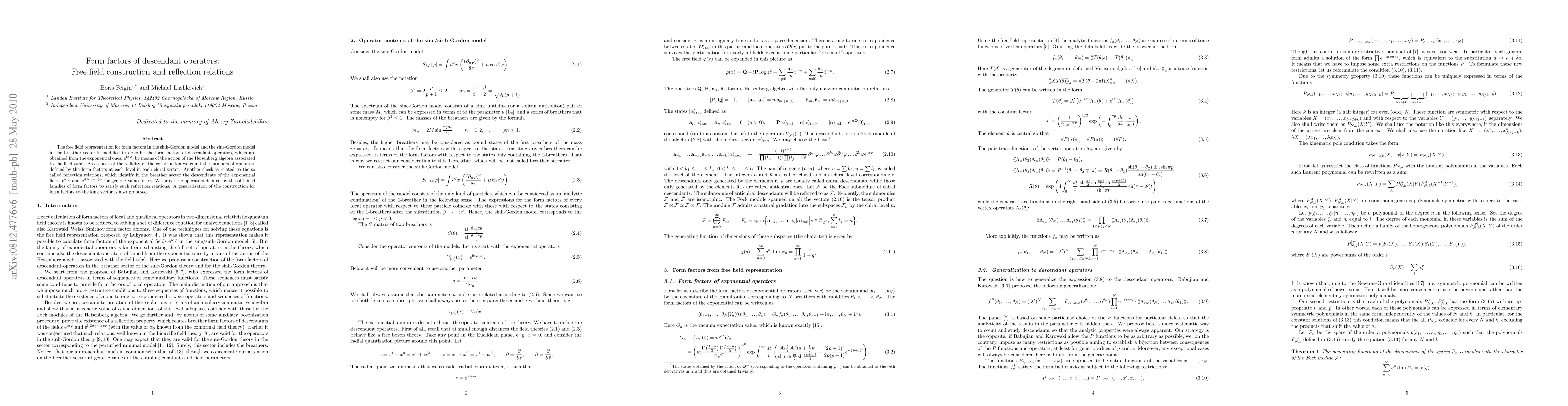 The free field representation for form factors in the sinh-Gordon model and the sine-Gordon model in the breather sector is modified to describe the form factors of descendant operators, which are obtained from the exponential ones, $\e^{\i\alpha\phi}$, by means of the action of the Heisenberg algebra associated to the field $\phi(x)$. As a check of the validity of the construction we count the numbers of operators defined by the form factors at each level in each chiral sector. Another check is related to the so called reflection relations, which identify in the breather sector the descendants of the exponential fields $\e^{\i\alpha\phi}$ and $\e^{\i(2\alpha_0-\alpha)\phi}$ for generic values of $\alpha$. We prove the operators defined by the obtained families of form factors to satisfy such reflection relations. A generalization of the construction for form factors to the kink sector is also proposed.