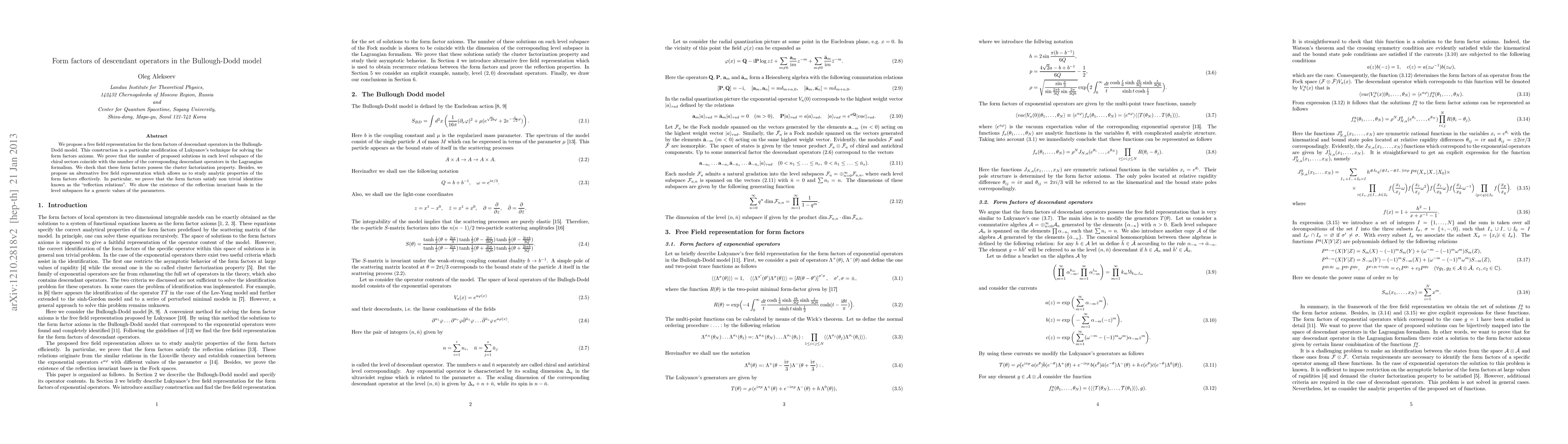 This paper proposes a free field representation for the form factors of descendant operators in the Bullough-Dodd model, demonstrating a modified Lukyanov approach. It verifies the equivalence between the number of solutions and descendant operators, and confirms the cluster factorization property and reflection relations for the form factors.
