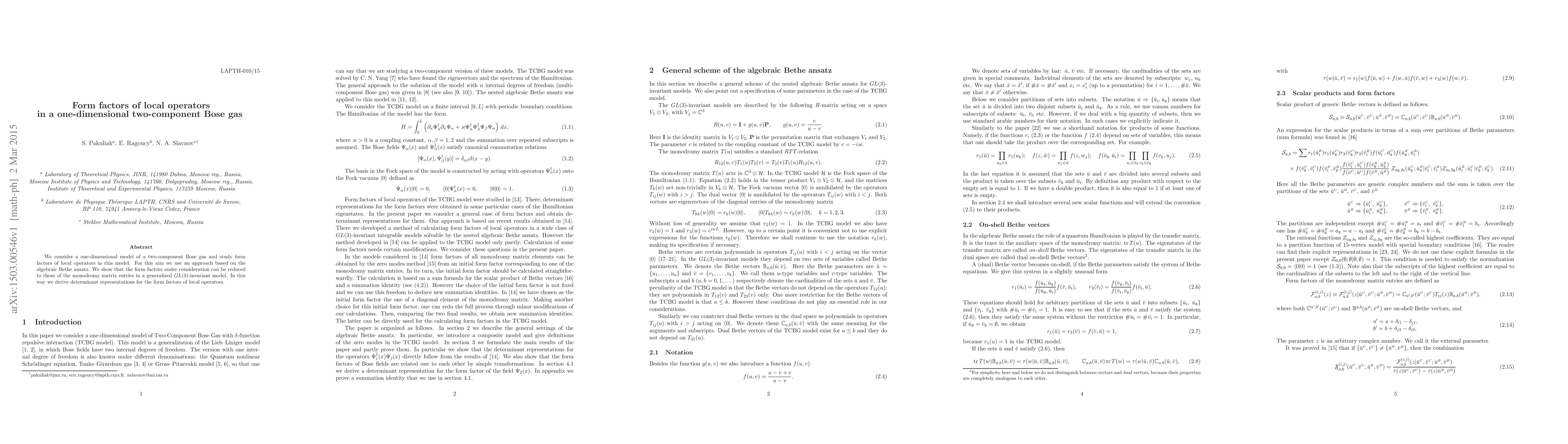 This paper investigates form factors of local operators in a one-dimensional two-component Bose gas using the algebraic Bethe ansatz. The study reveals that these form factors can be reduced to those of the monodromy matrix entries in a generalized GL(3)-invariant model, leading to determinant representations for the form factors.