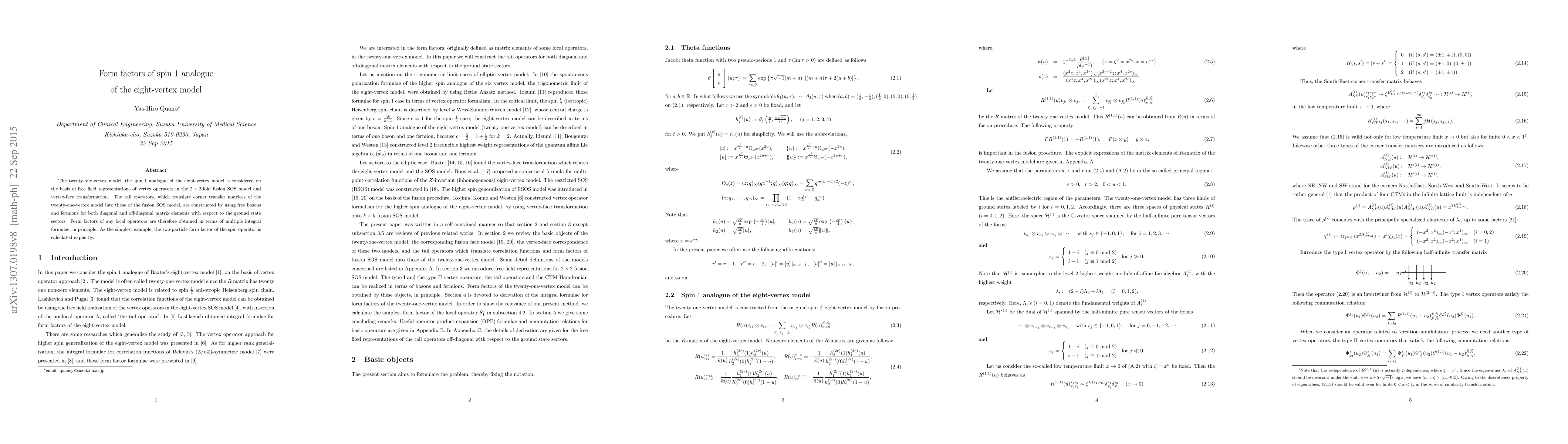Researchers developed a method to calculate form factors for the spin 1 analogue of the eight-vertex model, enabling the calculation of any local operator in terms of multiple integral formulae. The study uses free field representations of vertex operators and tail operators constructed from bosons and fermions.