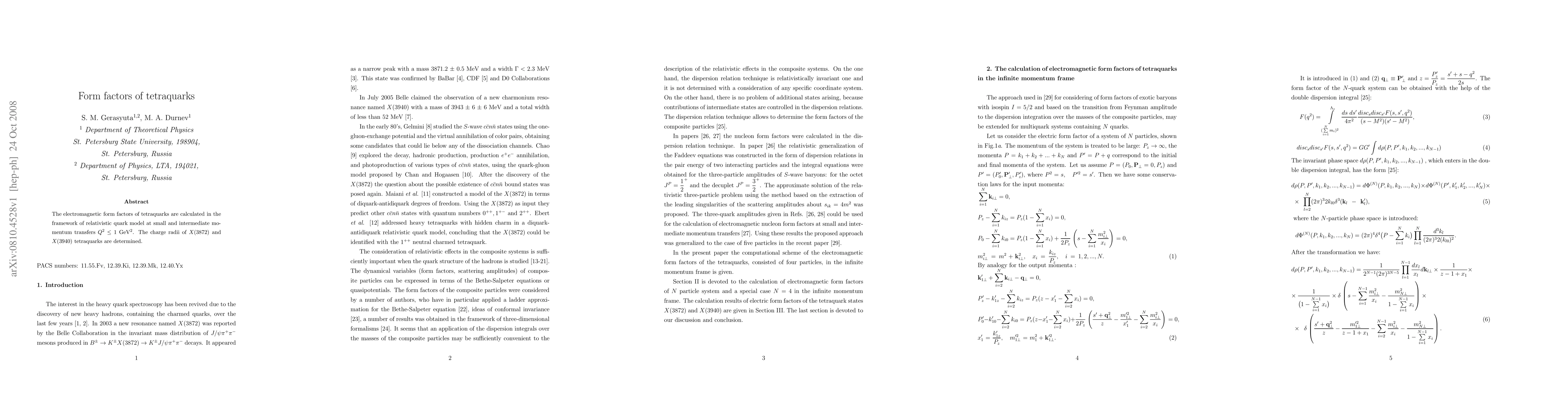 The electromagnetic form factors of tetraquarks are calculated in the framework of relativistic quark model at small and intermediate momentum transfers Q^2 < 1 GeV^2. The charge radii of X(3872) and X(3940) tetraquarks are determined.
