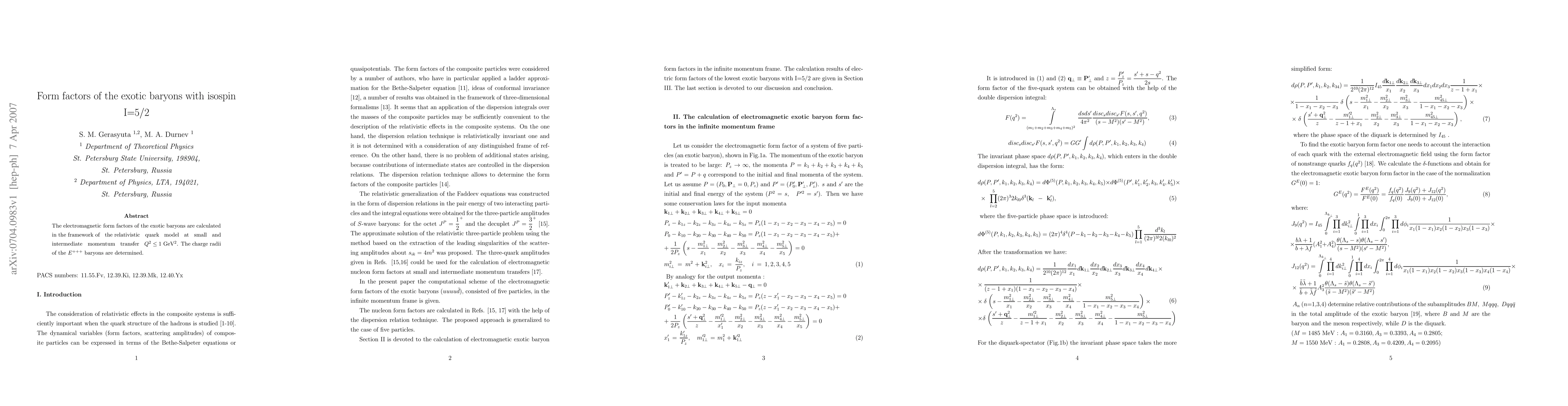 The electromagnetic form factors of the exotic baryons are calculated in the framework of the relativistic quark model at small and intermediate momentum transfer. The charge radii of the E+++ baryons are determined.