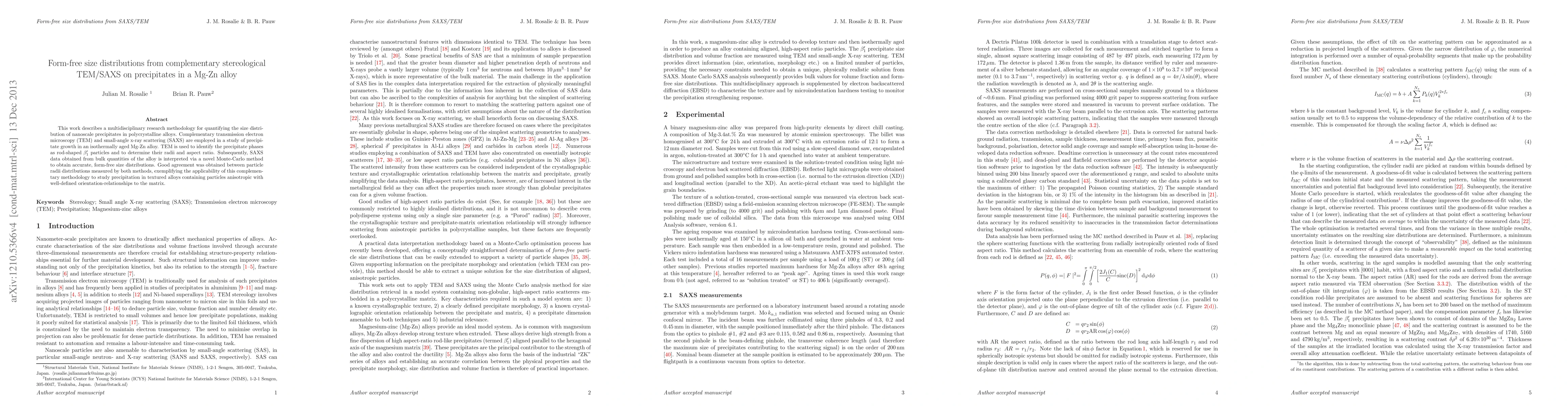 This paper presents a combined TEM and SAXS approach to quantify the size distribution of nanoscale precipitates in Mg-Zn alloys, revealing rod-shaped β' particles and validating the methodology through form-free size distribution analysis using a novel Monte-Carlo method. The results demonstrate the technique's effectiveness for studying anisotropic precipitates in textured alloys.