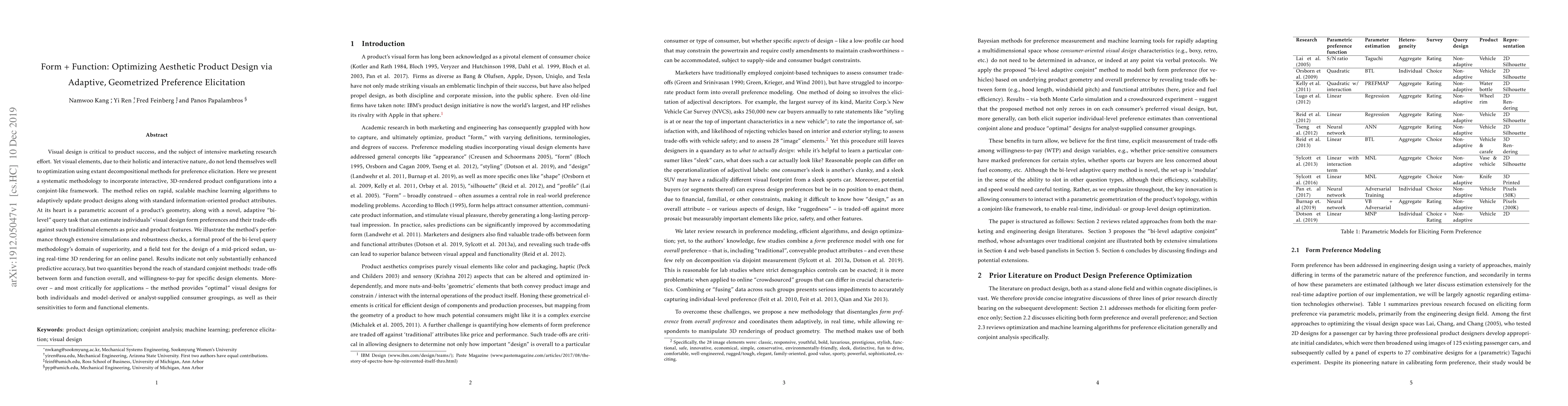 Visual design is critical to product success, and the subject of intensive marketing research effort. Yet visual elements, due to their holistic and interactive nature, do not lend themselves well to optimization using extant decompositional methods for preference elicitation. Here we present a systematic methodology to incorporate interactive, 3D-rendered product configurations into a conjoint-like framework. The method relies on rapid, scalable machine learning algorithms to adaptively update product designs along with standard information-oriented product attributes. At its heart is a parametric account of a product's geometry, along with a novel, adaptive "bi-level" query task that can estimate individuals' visual design form preferences and their trade-offs against such traditional elements as price and product features. We illustrate the method's performance through extensive simulations and robustness checks, a formal proof of the bi-level query methodology's domain of superiority, and a field test for the design of a mid-priced sedan, using real-time 3D rendering for an online panel. Results indicate not only substantially enhanced predictive accuracy, but two quantities beyond the reach of standard conjoint methods: trade-offs between form and function overall, and willingness-to-pay for specific design elements. Moreover -- and most critically for applications -- the method provides "optimal" visual designs for both individuals and model-derived or analyst-supplied consumer groupings, as well as their sensitivities to form and functional elements.