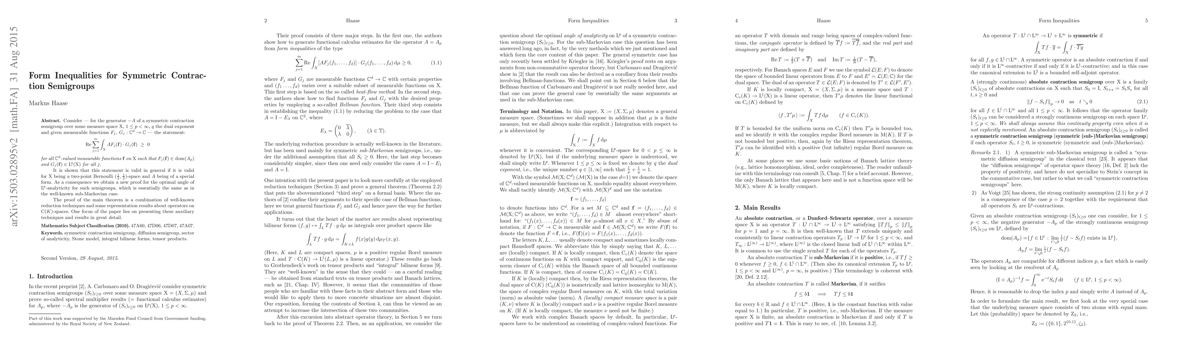 Consider --- for the generator \({-}A\) of a symmetric contraction semigroup over some measure space $\mathrm{X}$, $1\le p < \infty$, $q$ the dual exponent and given measurable functions $F_j,\: G_j : \mathbb{C}^d \to \mathbb{C}$ --- the statement: $$ \mathrm{Re}\, \sum_{j=1}^m \int_{\mathrm{X}} A F_j(\mathbf{f}) \cdot G_j(\mathbf{f}) \,\,\ge \,\,0 $$ {\em for all $\mathbb{C}^d$-valued measurable functions $\mathbf{f}$ on $\mathrm{X}$ such that $F_j(\mathbf{f}) \in \mathrm{dom}(A_p)$ and $G_j(\mathbf{f}) \in \mathrm{L}^q(\mathrm{X})$ for all $j$.} It is shown that this statement is valid in general if it is valid for $\mathrm{X}$ being a two-point Bernoulli $(\frac{1}{2}, \frac{1}{2})$-space and $A$ being of a special form. As a consequence we obtain a new proof for the optimal angle of $\mathrm{L}^{p}$-analyticity for such semigroups, which is essentially the same as in the well-known sub-Markovian case. The proof of the main theorem is a combination of well-known reduction techniques and some representation results about operators on $\mathrm{C}(K)$-spaces. One focus of the paper lies on presenting these auxiliary techniques and results in great detail.