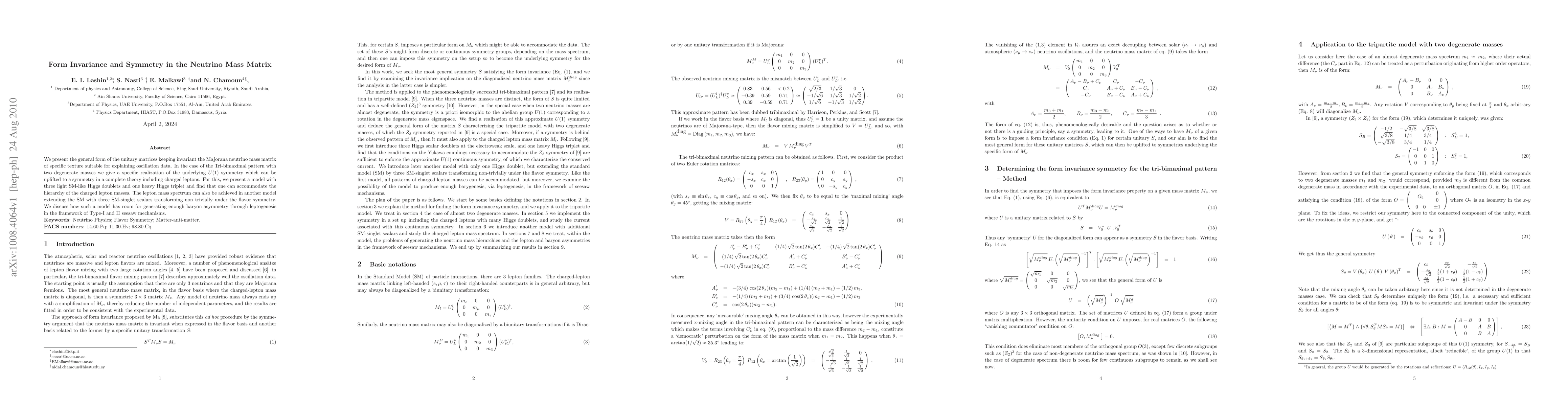 This paper explores the invariance properties of the Majorana neutrino mass matrix, particularly focusing on the tri-bimaximal pattern with two degenerate masses. It proposes a $U(1)$ symmetry model that can be extended to include charged leptons, utilizing three light Higgs doublets and one heavy Higgs triplet, and discusses its potential for generating baryon asymmetry via leptogenesis.