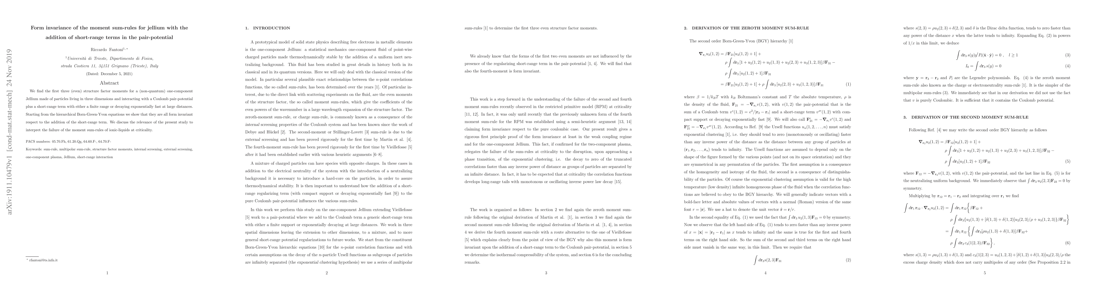 We find the first three (even) structure factor moments for a (non-quantum) one-component Jellium made of particles living in three dimensions and interacting with a Coulomb pair-potential plus a short-range term with either a finite range or decaying exponentially fast at large distances. Starting from the hierarchical Born-Green-Yvon equations we show that they are all form invariant respect to the addition of the short-range term. We discuss the relevance of the present study to interpret the failure of the moment sum-rules of ionic-liquids at criticality.