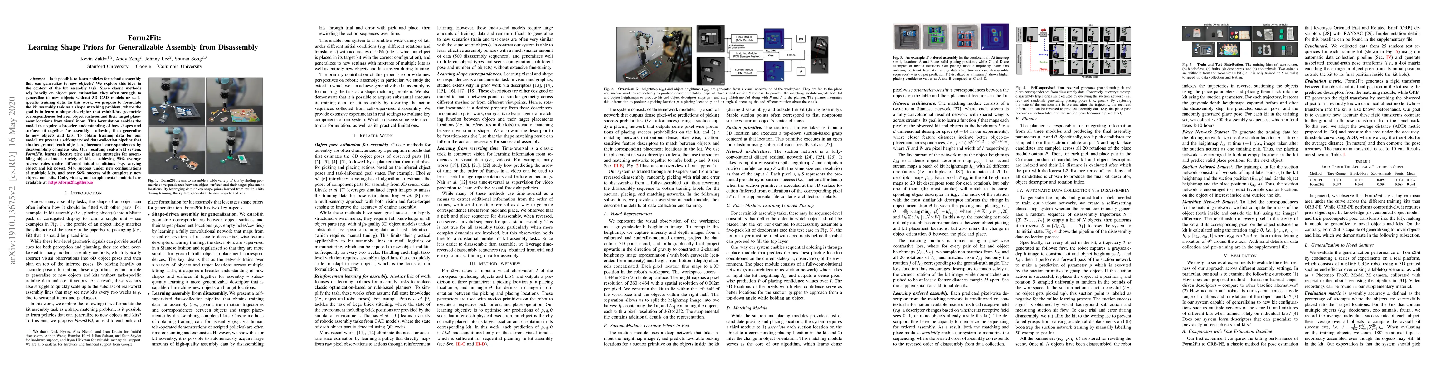 Is it possible to learn policies for robotic assembly that can generalize to new objects? We explore this idea in the context of the kit assembly task. Since classic methods rely heavily on object pose estimation, they often struggle to generalize to new objects without 3D CAD models or task-specific training data. In this work, we propose to formulate the kit assembly task as a shape matching problem, where the goal is to learn a shape descriptor that establishes geometric correspondences between object surfaces and their target placement locations from visual input. This formulation enables the model to acquire a broader understanding of how shapes and surfaces fit together for assembly -- allowing it to generalize to new objects and kits. To obtain training data for our model, we present a self-supervised data-collection pipeline that obtains ground truth object-to-placement correspondences by disassembling complete kits. Our resulting real-world system, Form2Fit, learns effective pick and place strategies for assembling objects into a variety of kits -- achieving $90\%$ average success rates under different initial conditions (e.g. varying object and kit poses), $94\%$ success under new configurations of multiple kits, and over $86\%$ success with completely new objects and kits.
