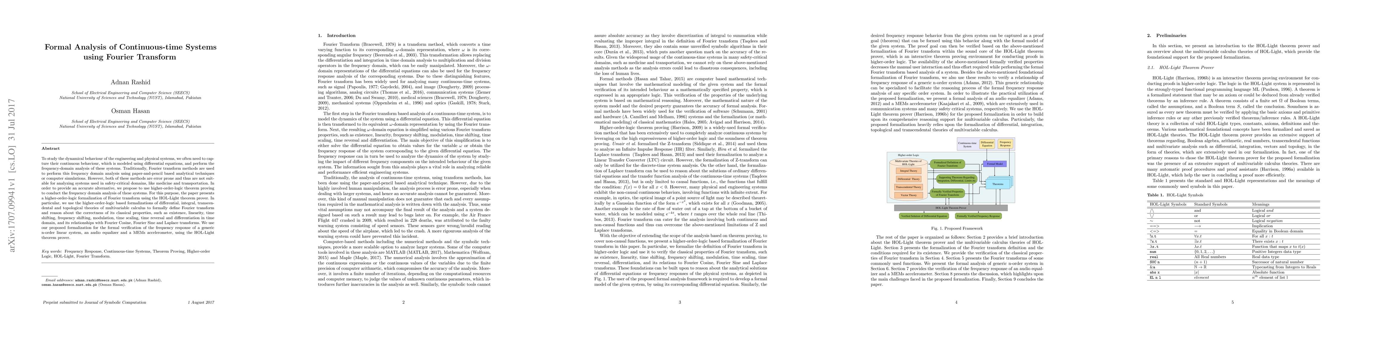 This paper proposes using higher-order-logic theorem proving to formally analyze the frequency domain behavior of continuous-time systems, addressing the inaccuracies of traditional Fourier transform methods. It presents a formalization of Fourier transform in HOL-Light and applies it to verify the frequency response of various systems.