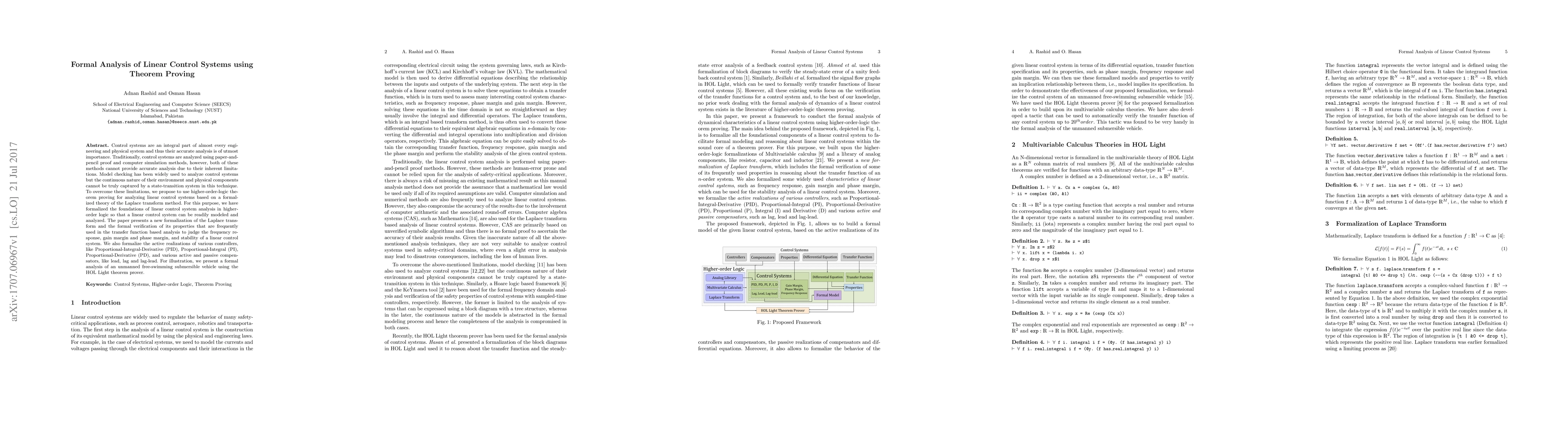 The research proposes a higher-order-logic theorem proving approach for formal analysis of linear control systems, utilizing a formalized Laplace transform theory and verifying properties like linearity, differentiation, and transfer functions.