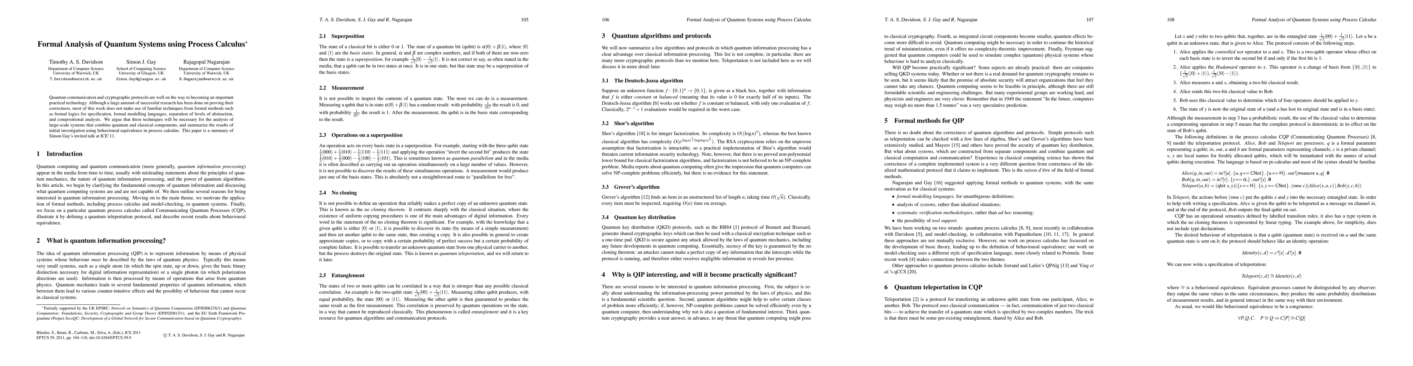 This paper advocates for the application of formal methods, including process calculus, to analyze quantum systems, emphasizing the necessity for large-scale quantum-classical hybrid systems. Initial results using behavioral equivalence in process calculus are presented, highlighting the potential for compositional analysis in quantum protocols.