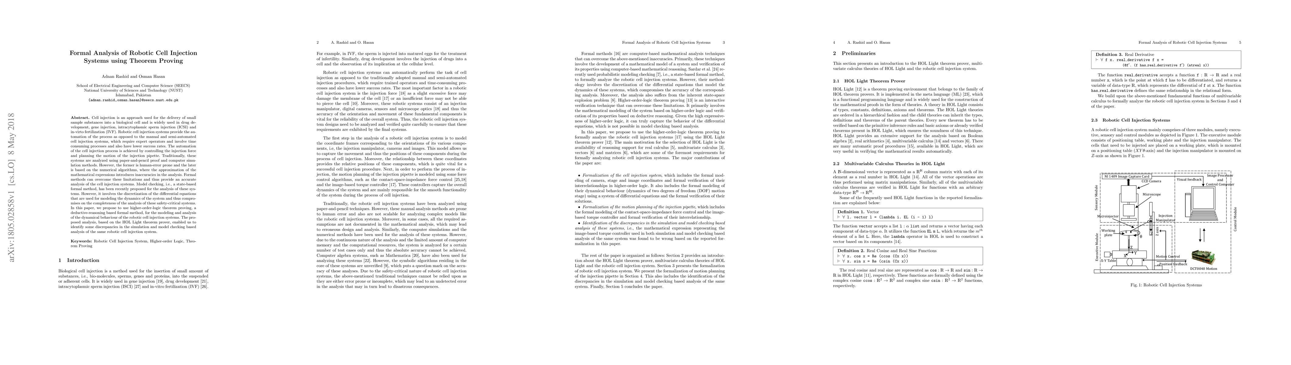 This paper proposes using higher-order-logic theorem proving for the formal analysis of robotic cell injection systems, aiming to overcome the limitations of traditional methods like paper-and-pencil proofs and computer simulations. The study identifies discrepancies in previous analyses using model checking and simulation, highlighting the benefits of the proposed deductive-reasoning based formal method.