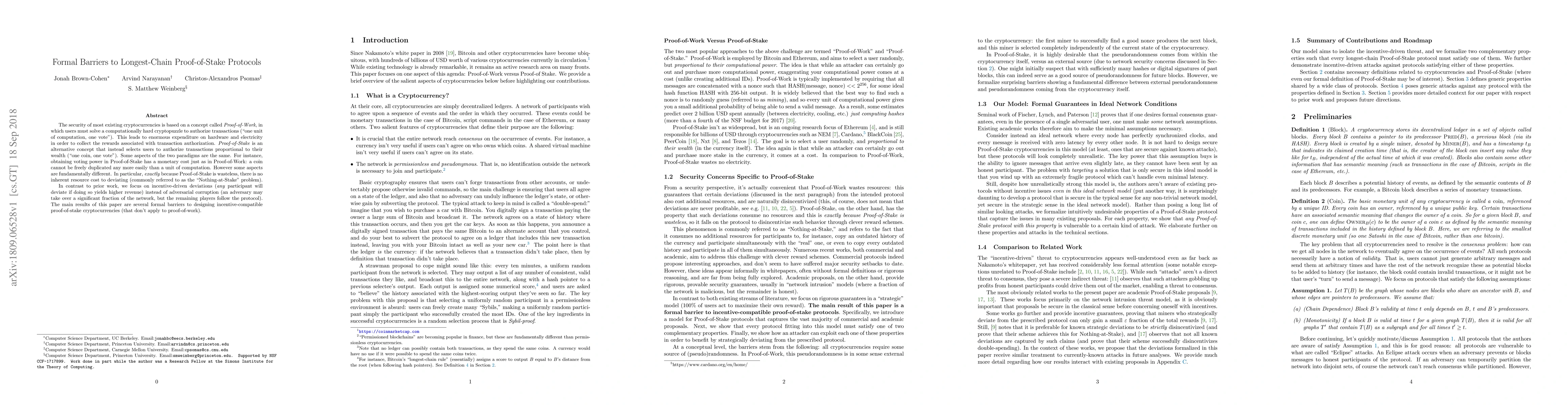 The paper presents formal barriers to incentive-compatible Proof-of-Stake protocols, distinguishing them from Proof-of-Work, and identifies vulnerabilities to predictable selfish mining and undetectable nothing-at-stake attacks in longest-chain variant protocols.