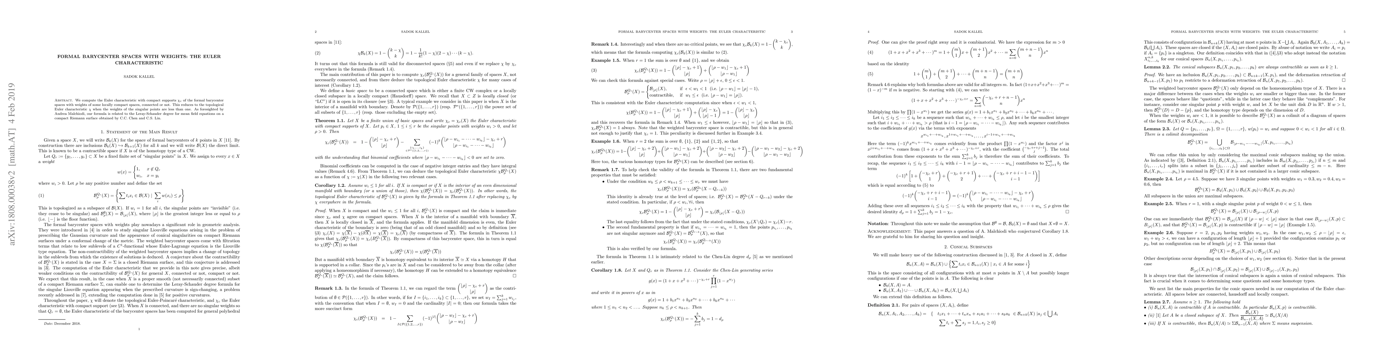 This paper computes the Euler characteristic with compact supports for formal barycenter spaces with weights in finite CW complexes, showing it reduces to the topological Euler characteristic when weights are less than one. The formula connects to the Leray-Schauder degree for mean field equations on compact Riemann surfaces.