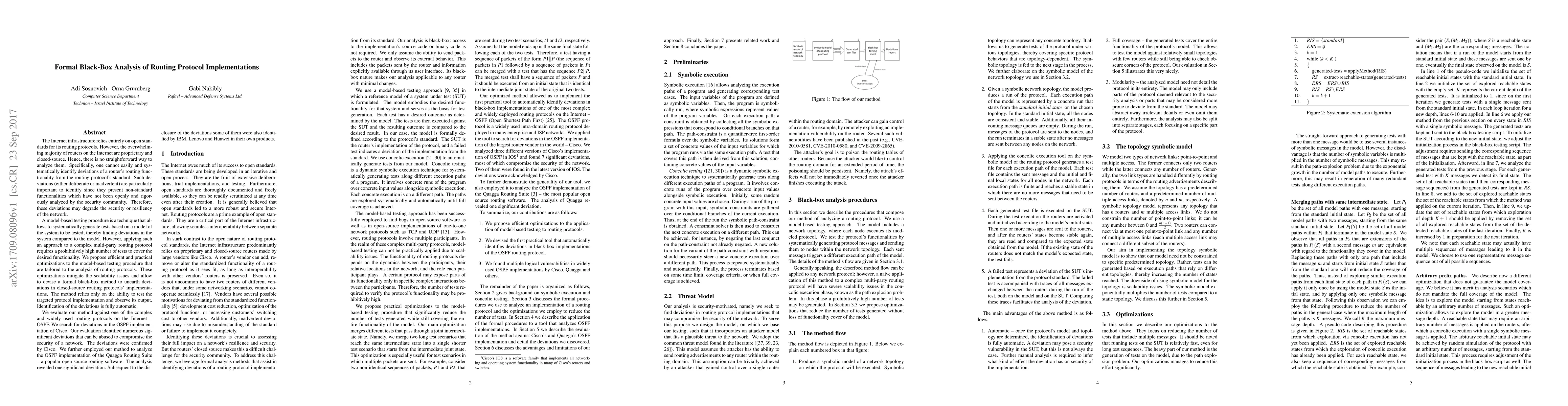 The Internet infrastructure relies entirely on open standards for its routing protocols. However, the majority of routers on the Internet are closed-source. Hence, there is no straightforward way to analyze them. Specifically, one cannot easily identify deviations of a router's routing functionality from the routing protocol's standard. Such deviations (either deliberate or inadvertent) are particularly important to identify since they may degrade the security or resiliency of the network. A model-based testing procedure is a technique that allows to systematically generate tests based on a model of the system to be tested; thereby finding deviations in the system compared to the model. However, applying such an approach to a complex multi-party routing protocol requires a prohibitively high number of tests to cover the desired functionality. We propose efficient and practical optimizations to the model-based testing procedure that are tailored to the analysis of routing protocols. These optimizations allow to devise a formal black-box method to unearth deviations in closed-source routing protocols' implementations. The method relies only on the ability to test the targeted protocol implementation and observe its output. Identification of the deviations is fully automatic. We evaluate our method against one of the complex and widely used routing protocols on the Internet -- OSPF. We search for deviations in the OSPF implementation of Cisco. Our evaluation identified numerous significant deviations that can be abused to compromise the security of a network. The deviations were confirmed by Cisco. We further employed our method to analyze the OSPF implementation of the Quagga Routing Suite. The analysis revealed one significant deviation. Subsequent to the disclosure of the deviations some of them were also identified by IBM, Lenovo and Huawei in their own products.