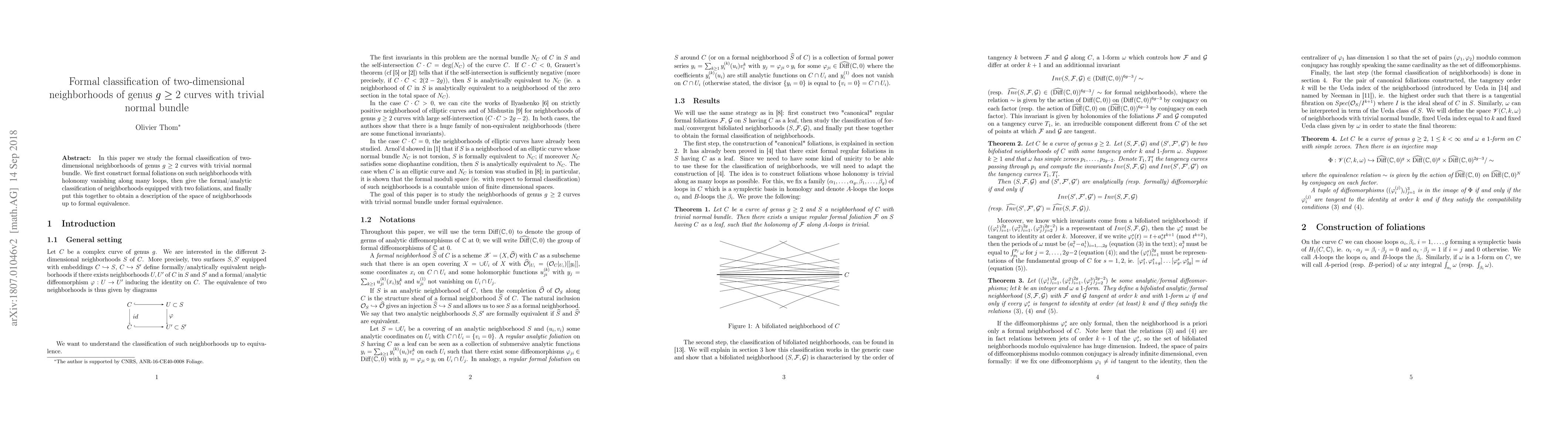 In this paper we study the formal classication of two-dimensional neighborhoods of genus g $\ge$ 2 curves with trivial normal bundle. We first construct formal foliations on such neighborhoods with holonomy vanishing along many loops, then give the formal/analytic classication of neighborhoods equipped with two foliations, and finally put this together to obtain a description of the space of neighborhoods up to formal equivalence.